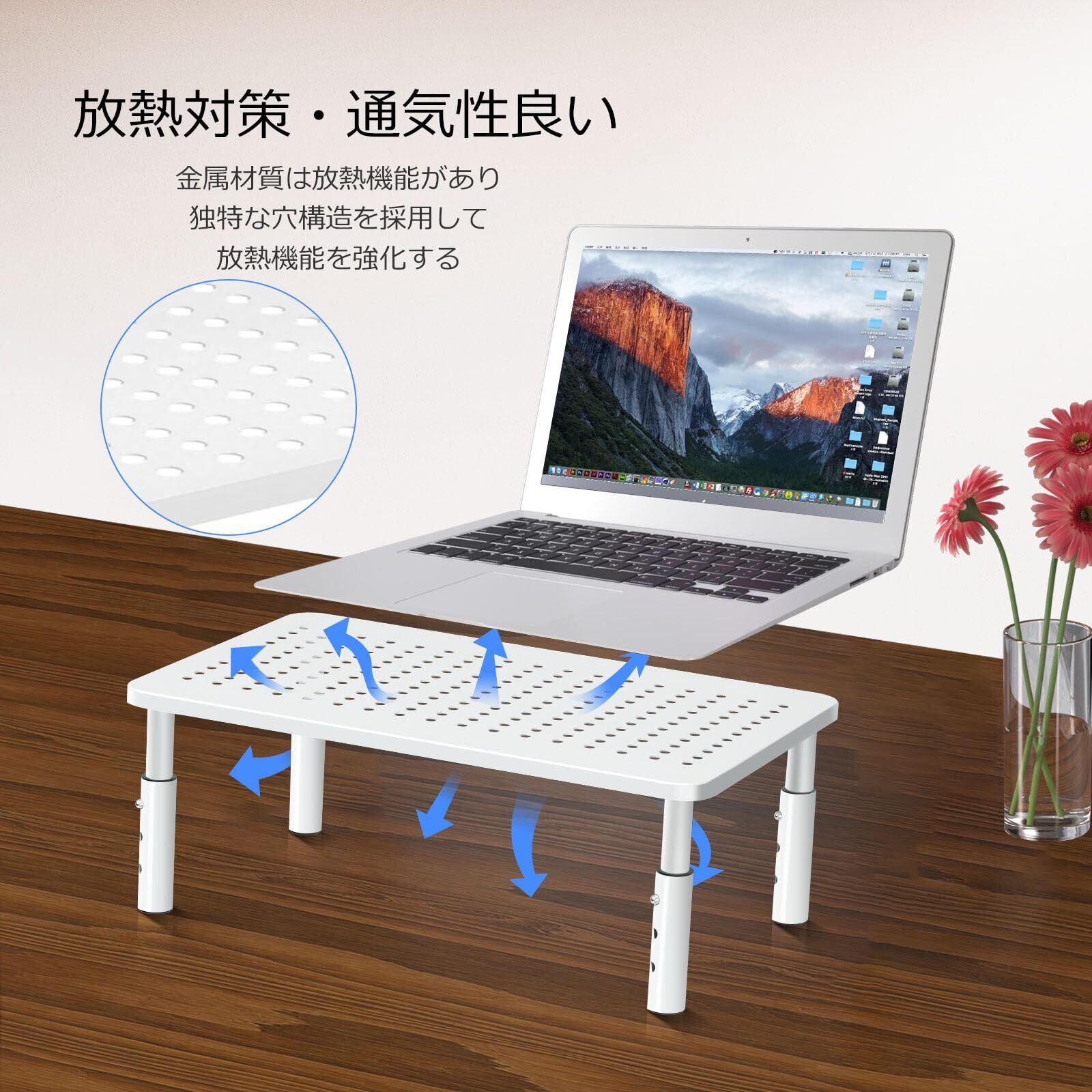 【丈夫で安定性抜群】頑丈なスチール製で、しっかり物を支えます。脚の下部にはゴムパッドがあるので、滑り止めることができて、傷を防止することもできます。20kgまでのノートパソコンとモニターを載せることができます。