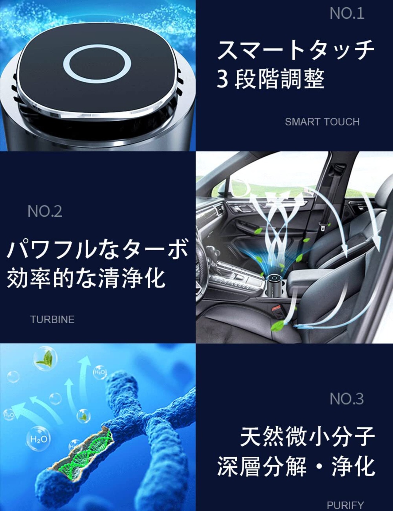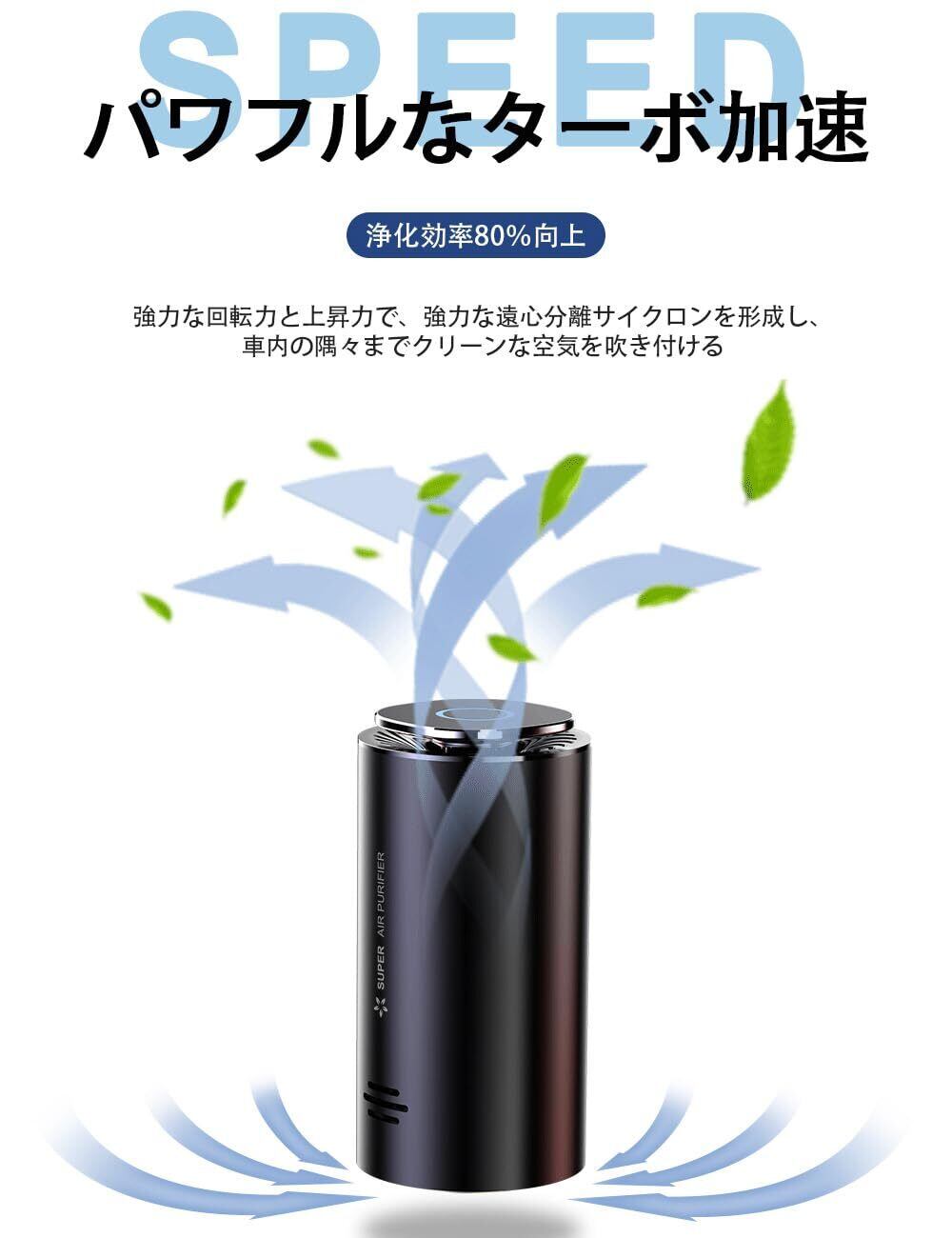 【深層分解・浄化】活性炭は強力な吸着能力を持ち、天然微小分子を放出して部屋などに付着したニオイ、ホルムアルデヒド、スモッグ(PM2.5)や煙などを除去し、ホコリや花粉をしっかり捕集し、カビや雑菌の繁殖も抑制できて、空気の質を改善する機能を持っています。パワフルなターボ加速ので、強力な回転力と上昇力で、強力な遠心分離サイクロンを形成し、車内の隅々までクリーンな空気を吹き付けます。季節を問わず1年を通じて使える卓上空気清浄機です。