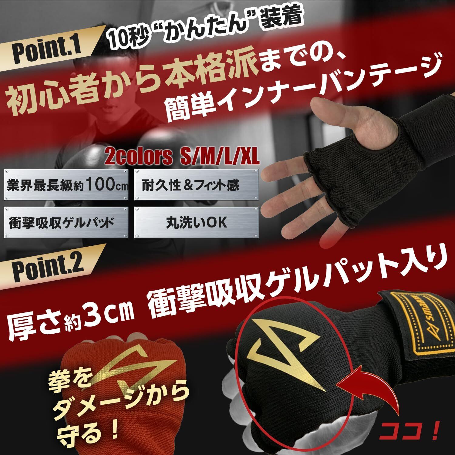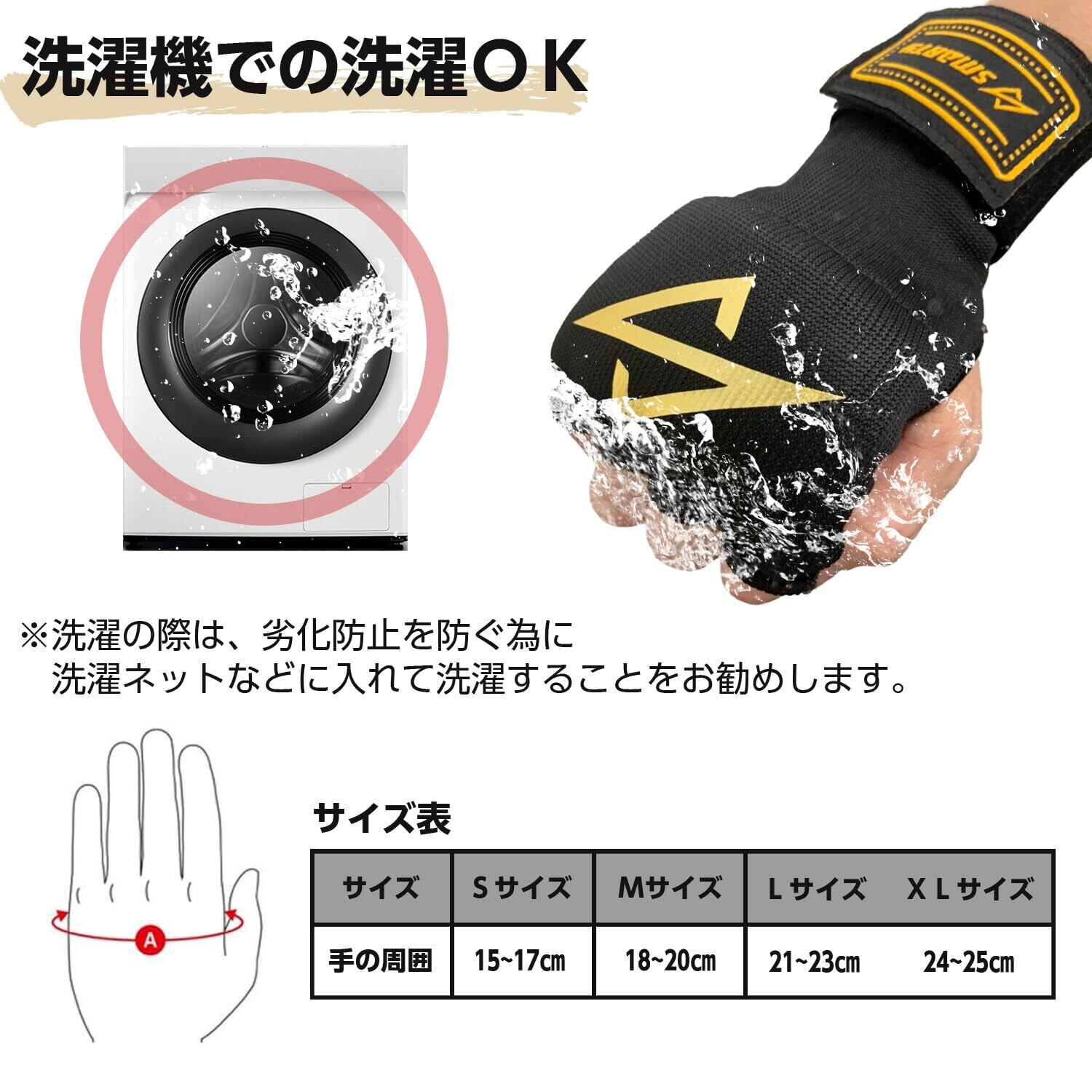 SMARTY 【元世界ランカー監修&動画付】 バンテージ 簡単 マジックテープ式 インナーグローブ ボクシング MMA 衝撃吸収ゲルパッド (S ブラック)