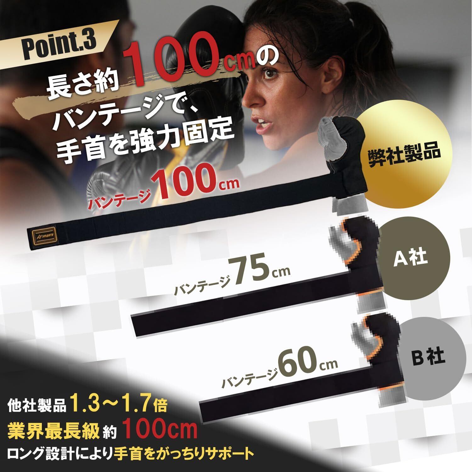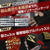 WBCライトフライ級元世界ランカーでもあり、某TV出演のパーソナルトレーナーでもある戎岡選手との共同開発。 拳と手首のダメージ軽減を考え、約3㎝の衝撃吸収ゲルパッドや業界最長級の手首に巻き付ける約100㎝のバンテージを採用。