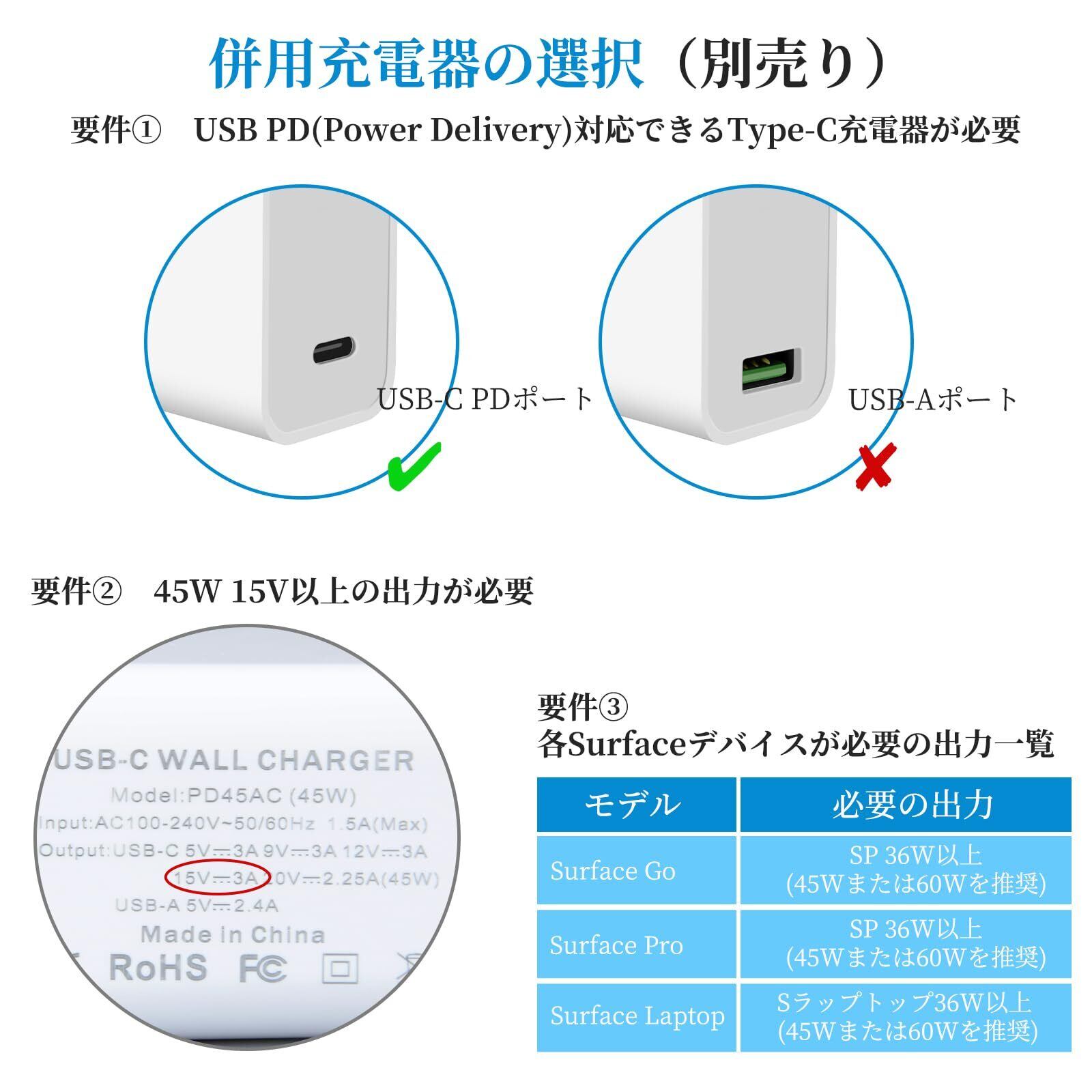 【ご購入前に必読】このUSB-C to Surface 充電ケーブルは45W、15V以上のPD対応の充電器と一緒にご使用しなければ、サーフェスに充電できないです。必ずご了承いただきましたの上でご購入をお願いいたします。