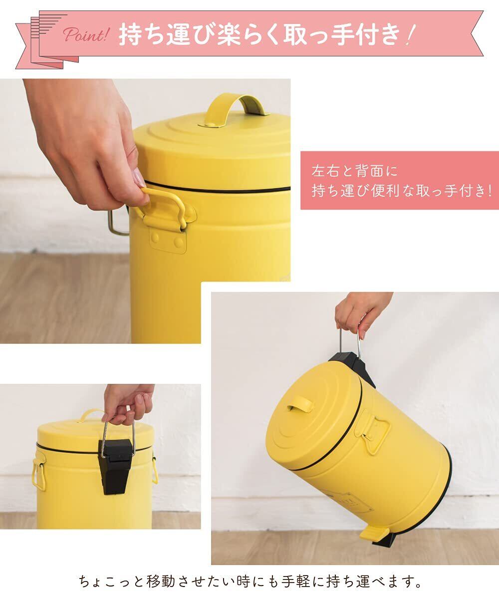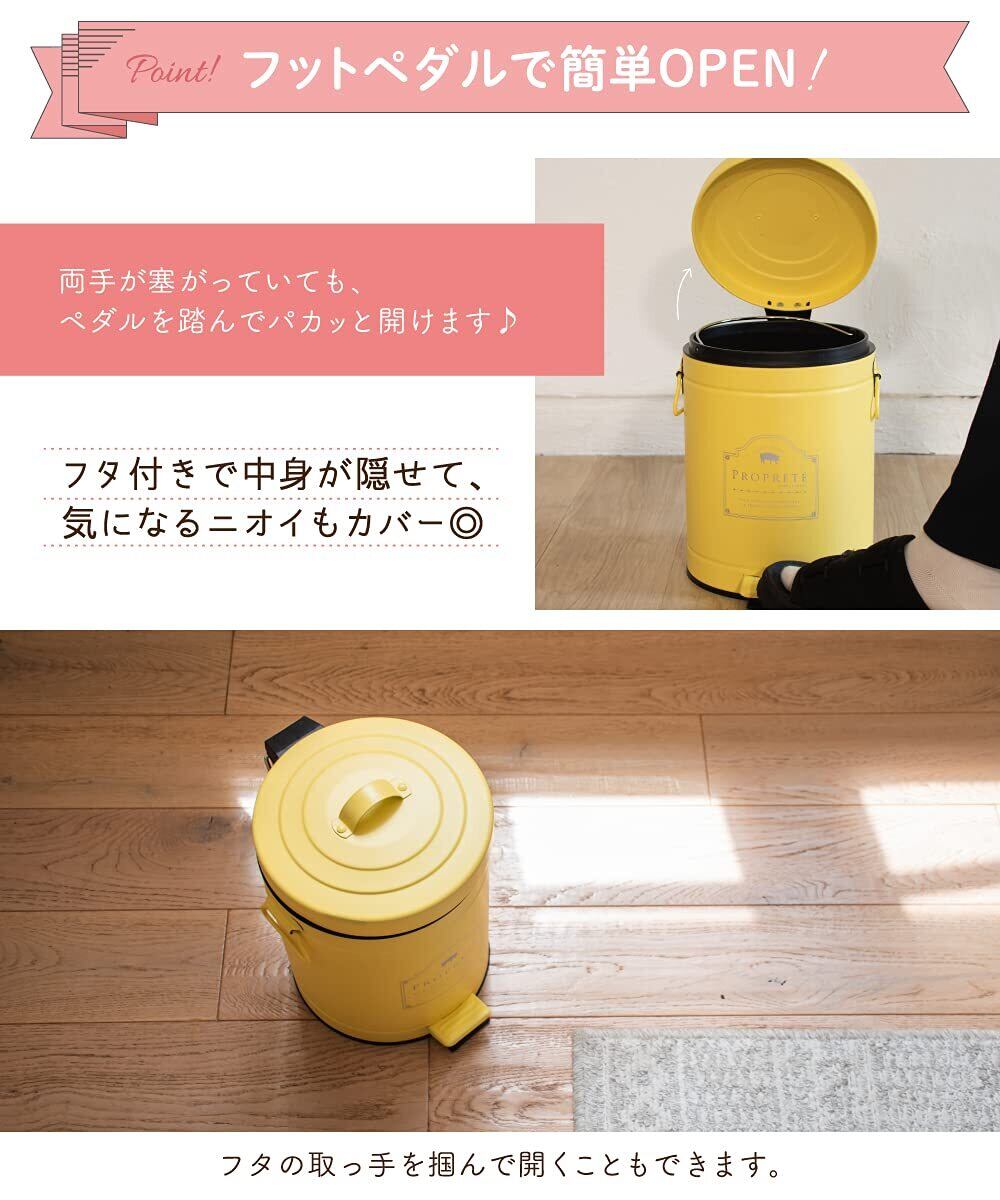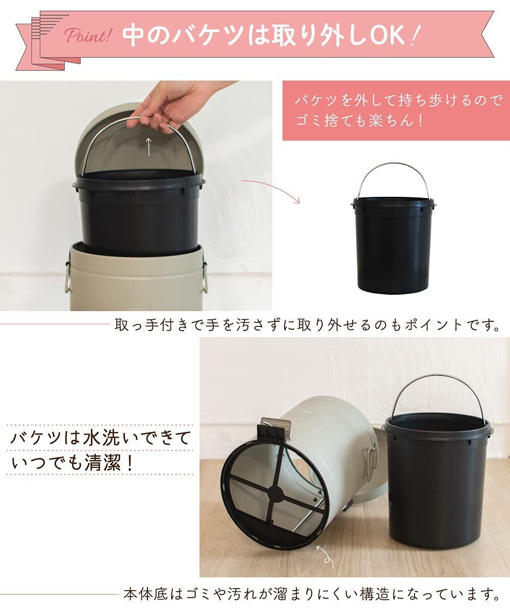 脚でペダルを踏むとフタが開き、両手がふさがっていてもゴミ箱に触れることなく捨てることができます。内バケツは取り外し可能なのでゴミが捨てやすいです。中が汚れてしまってもバケツを水洗いすれば清潔にお使いいただけます。