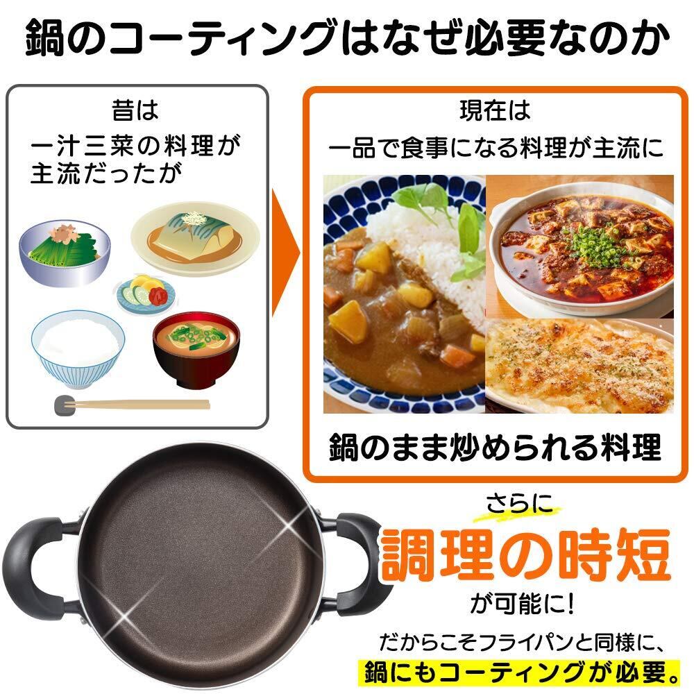 品質表示【両手なべ】・表面加工/内側:ふっ素樹脂塗膜加工/外側:(底面を除く)焼付け塗装・材料の種類/本体:アルミニウム合金/ハンドル:アルミニウム合金、フェノール樹脂/はり底:ステンレス鋼(クロム16%)/底の厚さ:2.6mm(はり底含む)