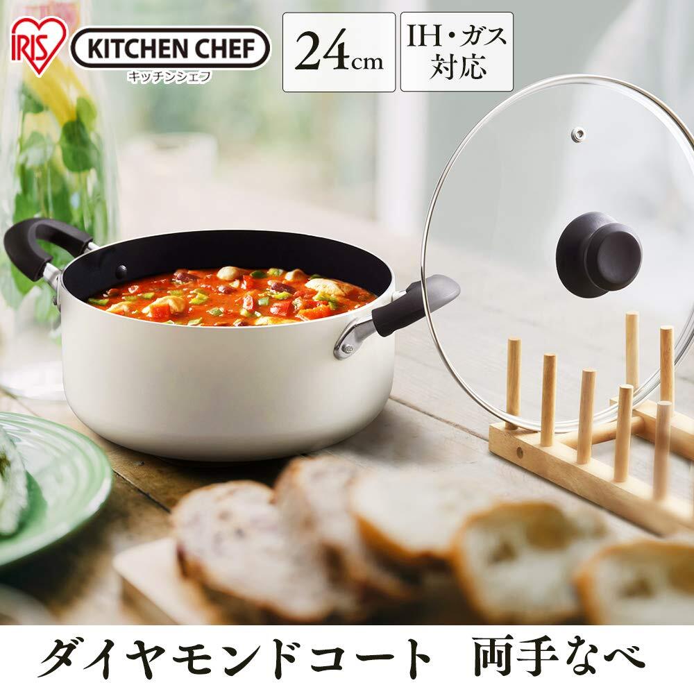 アイリスオーヤマ 両手鍋 24㎝ 鍋 蓋つき ガス火/IH対応 ガラス蓋付き ダイヤモンドコート 長持ち こびりつきにくい お手入れ簡単 ホワイト DIS-P24