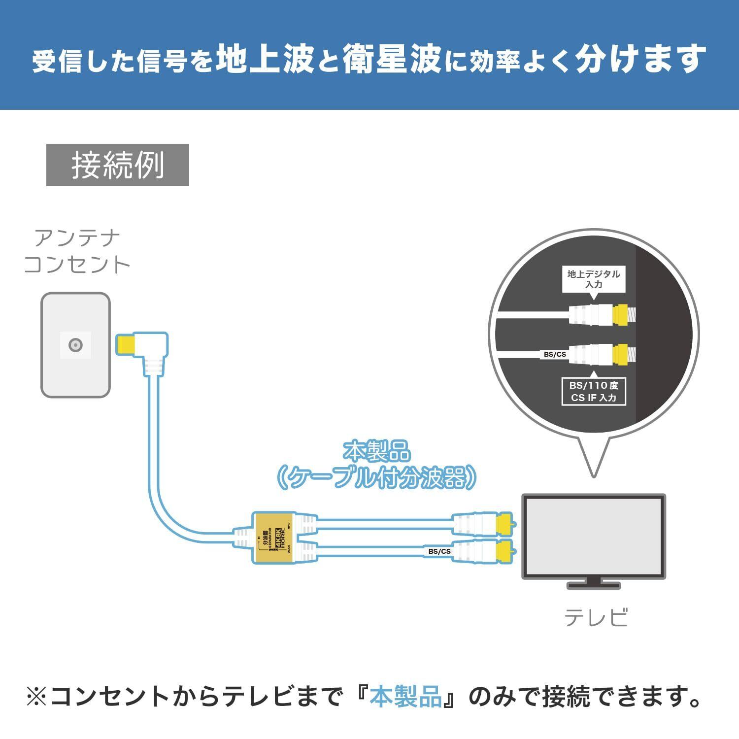 【入力側ケーブル仕様】 ●ケーブル規格:S-2.5C-FB ●コネクタ規格:F型 ●コネクタ形状:L字差込式(金メッキ仕様) ●コネクタサイズ:W約14.8 x H約14.4 x D約30.2 mm ●インピーダンス:75Ω ●ケーブル直径:3.5mm ●ケーブル長:2m