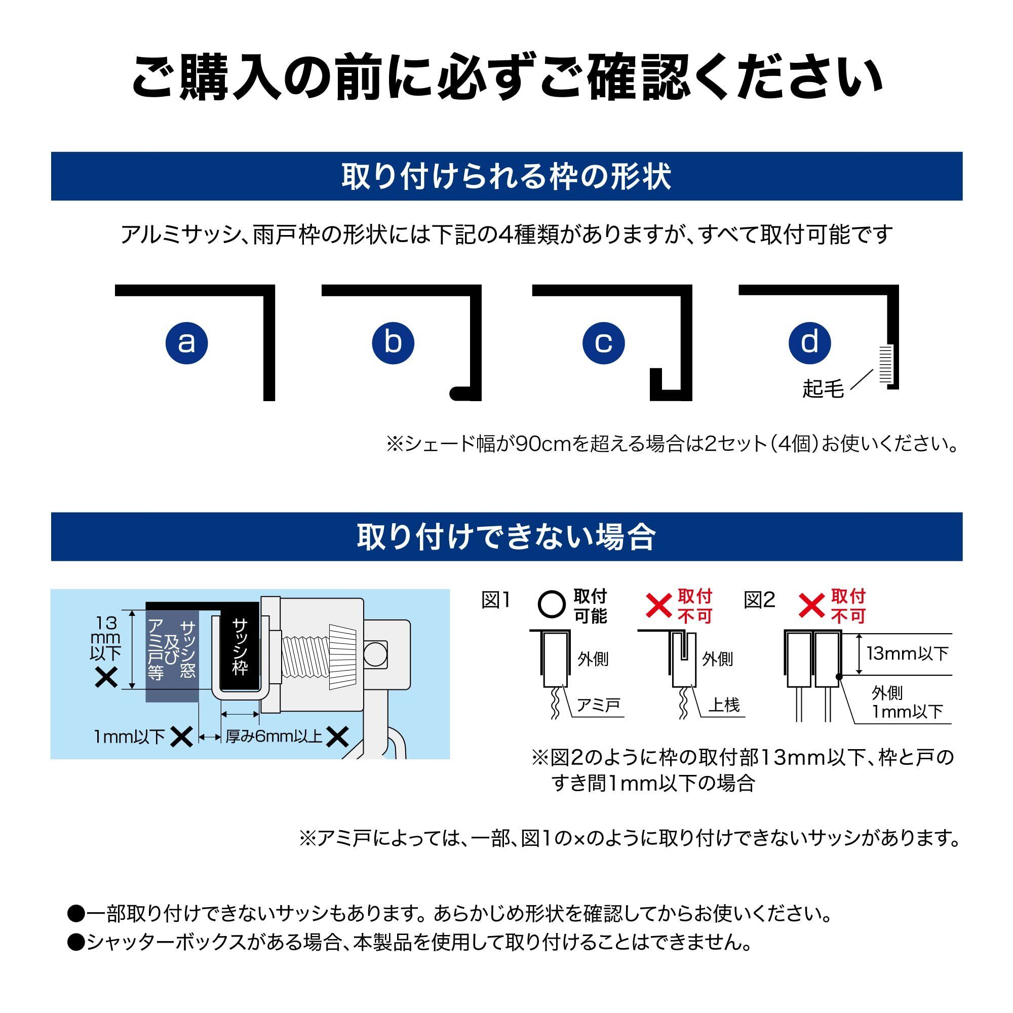 必ず取付け場所やアルミサッシ、雨戸枠の形状等ご確認いただき取付け方法等ご理解いただいてからご購入をお願いいたします。
