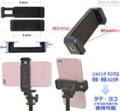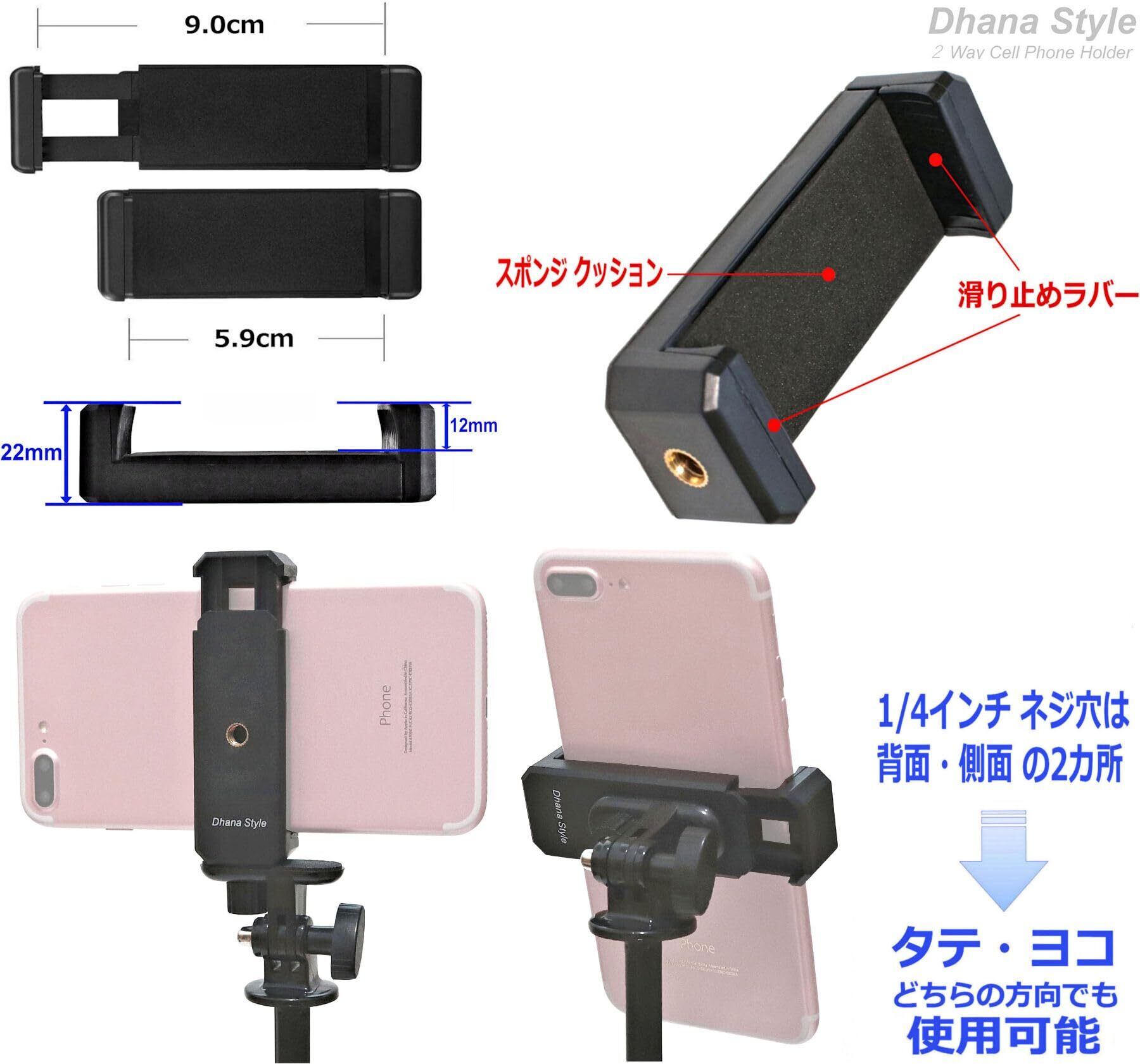 【スマホホルダー仕様】 ネジ穴径(三脚穴);1/4インチ →→ 側面と背面の2か所にありお好みのアングルに応じて使い分けが可能、スマホをホルダから取り外すことなくタテ/ヨコ どちらの方向でも使用可能です。 重さ; 約25g, 材質;プラスチック(ABS樹脂), 対応可能スマホ幅: 約62〜90mm(iPhone12, iPhone11, iPhone X, iPhone 8, 8plus, 7, 7plus, 6, 6plus, Samsung Galaxy S6 S5 S4 S3 Note 4 Note 3,等対応可) *4インチ幅のモデルには対応いたしません (iPhone4, iPhone5, 5S, iPhone SE 等 は対応不可) ---> ご使用のスマホ幅をお確かめ上ご購入下さい。 ※スマホにてご使用の際は付属の専用アダプタをご使用下さい。 三脚(トライポッド)、一脚、自撮り棒、雲台、卓上スタンド、ハンドグリップ、クネクネ 三脚 などに装着して スマホでのイラスト、写真、動画鑑賞、電話 やタイムラプス 撮影 などでもご使用いただけます。