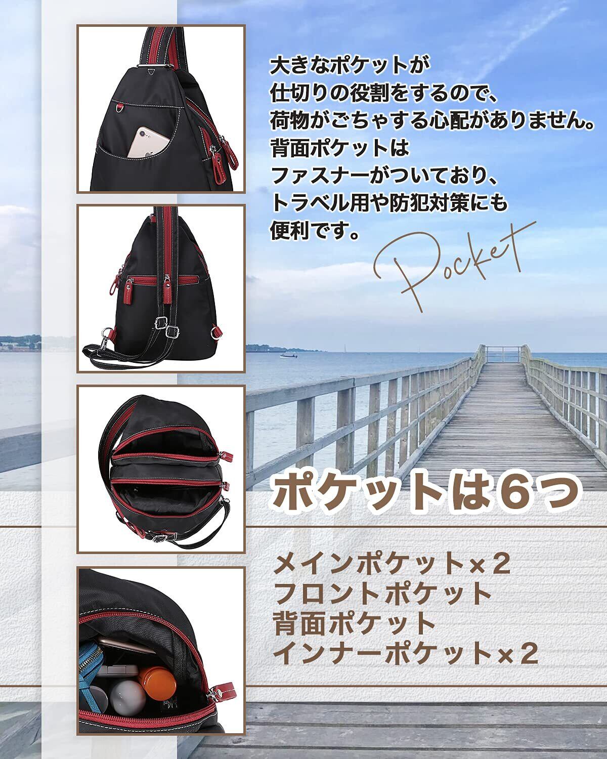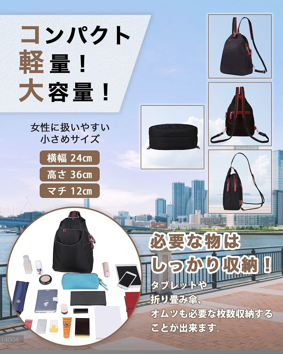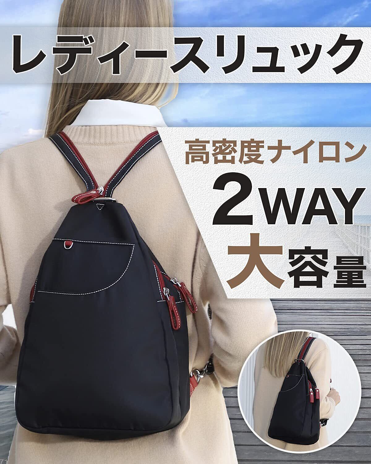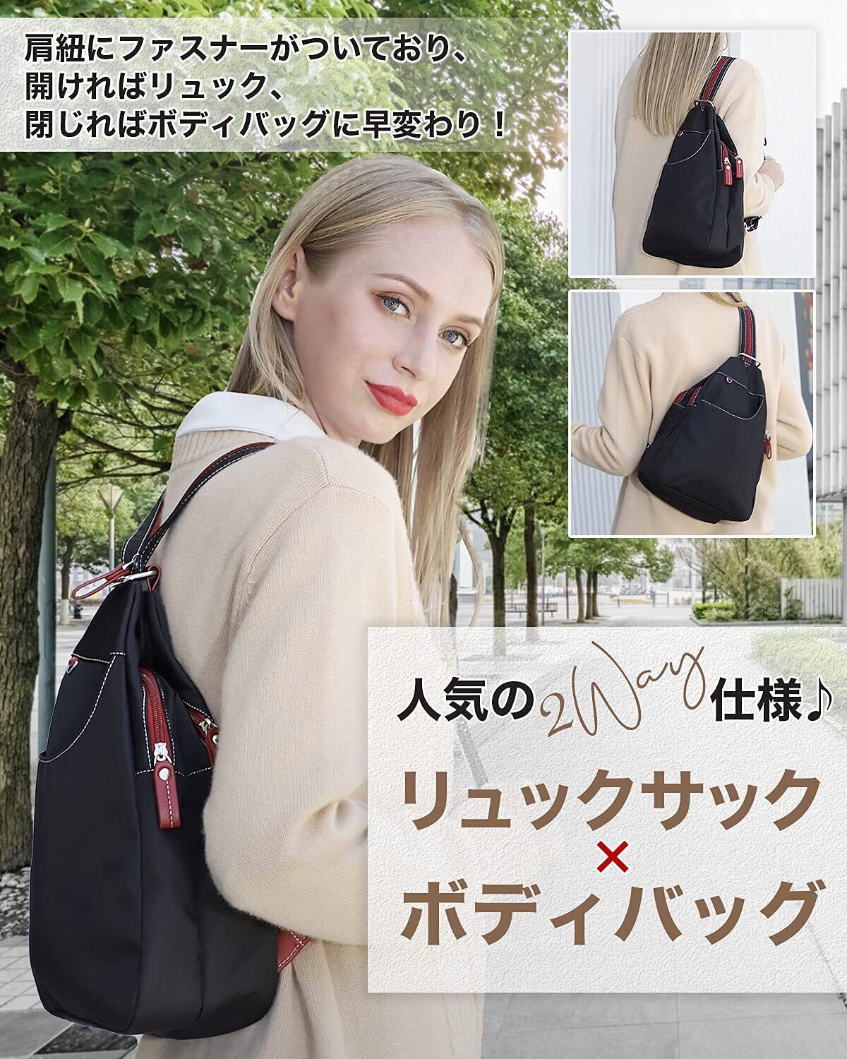 [ケーエルユー] リュックサック レディース バックパック ボディバッグ 斜めがけ 軽量 ナイロン 防水 (ブラック無地)