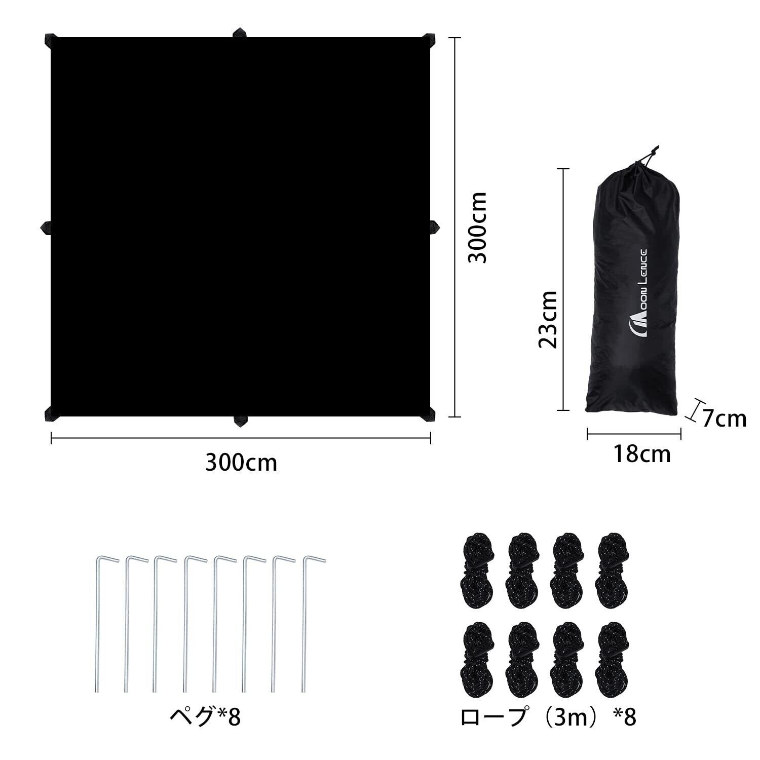 【タープ仕様】生地:190Tポリエステル、ブラックガム塗層 / 耐水圧:3000mm / 本体サイズ:3m×3m / 収納サイズ:約23x18x7cm / セット重量:約1.08kg(ペグ&ロープ含む) 内容物:タープ本体×1、自在付きロープ×8本、ペグ×8本、収納袋×1枚(ご注意:本製品にポールは付属しません。別途を買い求めください。)