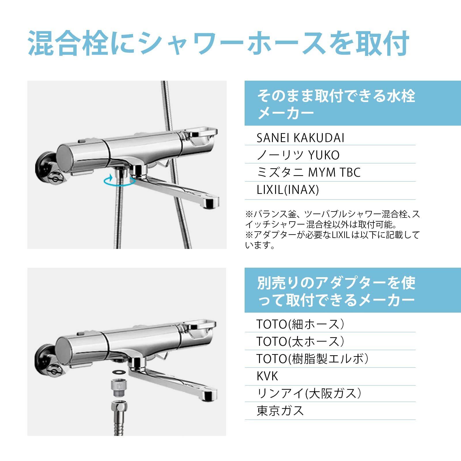 [適用する混合栓メーカー] 本品と混合栓を接続する側のネジサイズはG1/2です。本品はLIXIL(INAX),SAN-EI,MYMの混合栓にそのまま取付けできます。※LIXIL(INAX)バランス釜、ツーバブルシャワー混合栓、スイッチシャワー混合栓以外は取付可能です。