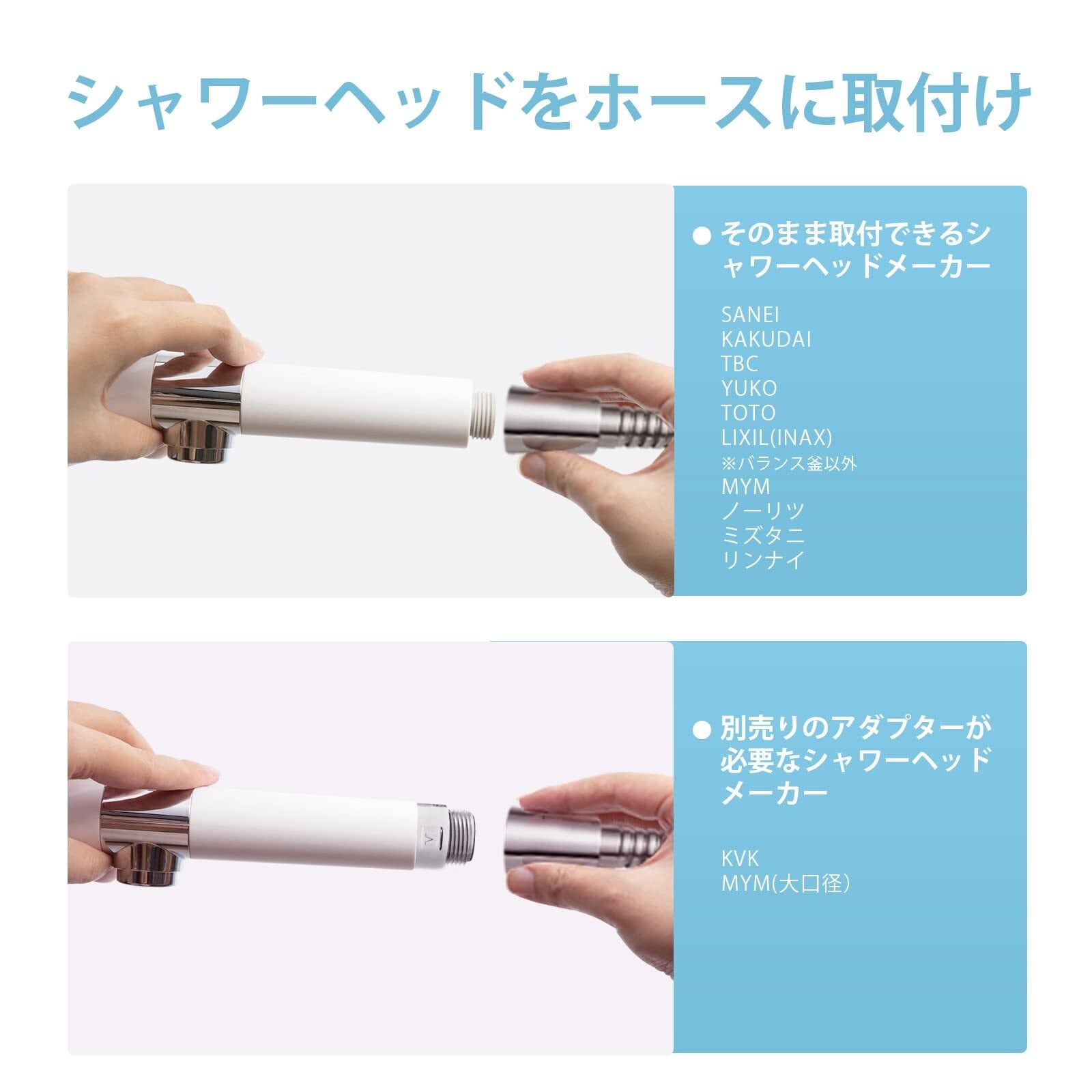 [適用するシャワーヘッドメーカー] 本品とシャワーヘッドを接続する側のネジサイズはG1/2です。本品はTOTO、LIXIL(INAX)※バランス釜除外、SAN-EI、カクダイのシャワーヘッドに直接取付できます。一部シャワーヘッドはネジサイズは合いますが、ヘッド根元のo-ringが邪魔になって接続できない可能性があります。その場合、シャワーヘッド根元のo-ringを取り外してください。o-ringを取り外した後に、水漏れが発生する場合、付属のパッキンを追加してく見てください。