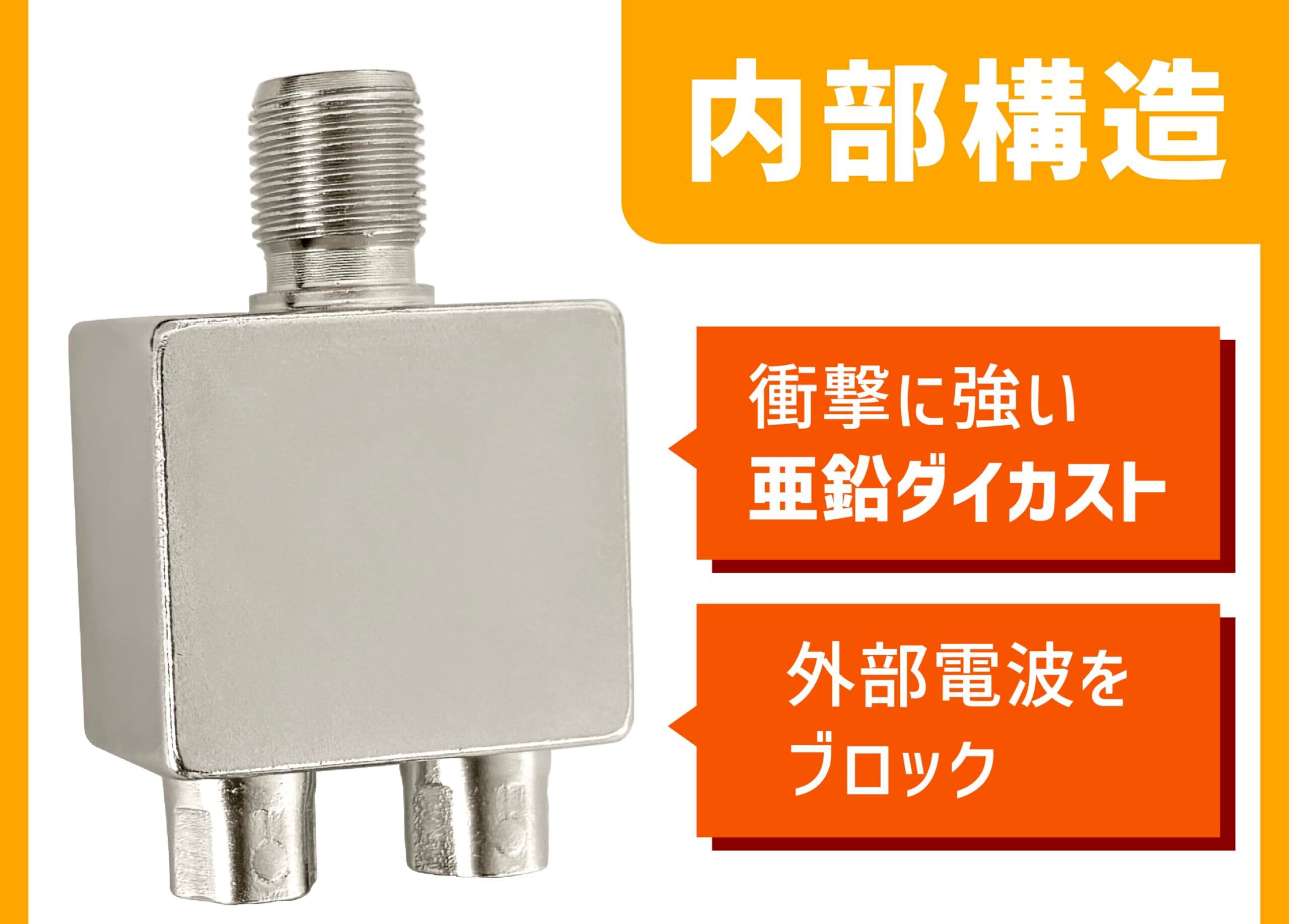 小型ボディは金属ケースで外部からのノイズをしっかりガード!内部からの電波漏洩でWi-Fiや携帯電話などの速度低下や通信不良を防ぎます。ケーブルは細くて取り回しやすい2C-FBケーブル採用し、よりシールド性を高めた3重シールドでノイズをガード。 ケーブル入力/出力一体型のアンテナ分波器で出力側のコネクタがネジ式を採用してありますのでしっかり接続をして接続損失を軽減。出力側のケーブル長は配線の邪魔にならないに20cm。
