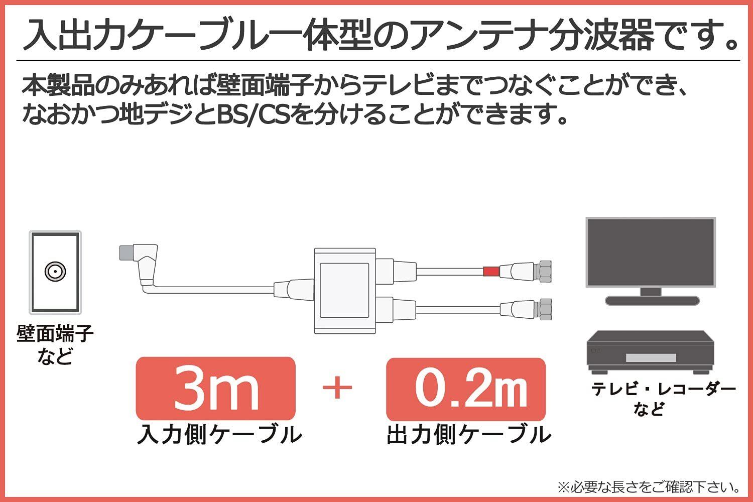 分波器ケーブル長:20cm、出力端子:F型接栓プラグ、入力ケーブル長:3m、F型プラグ(L型)、カラー:ホワイト、プラグ部分:ニッケルメッキ