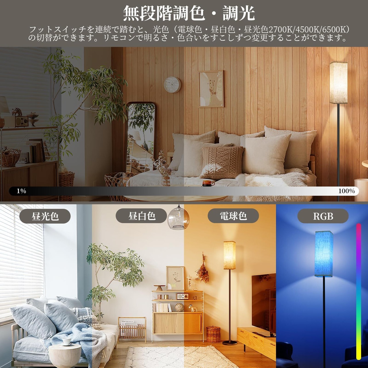 【3段階色温度調整・便利なフットスイッチ】フットスイッチを連続で踏むと、光色(電球色・昼白色・昼光色 2700K/4500K/6500K)の切替ができます。座ったまま足を伸ばすだけで電源をOFFにでき、とても便利です。なお、電源コードの長さは約165CMで部屋のコーナーまたはソファ脇などのコンセントから離れた場所に使えます。