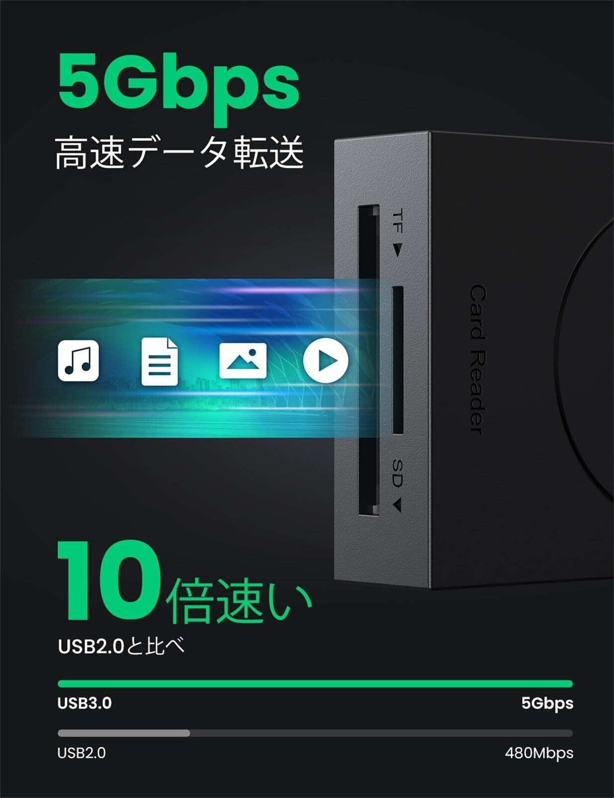 USB3.0高速伝送:USB 2.0より10倍ぐらい速い5Gbpsのスーパー転送スピードで30MB/48MB/60MB/95MBなど異なる速度率カードをサポートします。錫メッキ無酸素銅線と多重シールド構造を採用して有効にデータ送信中の電波干渉を防止します。