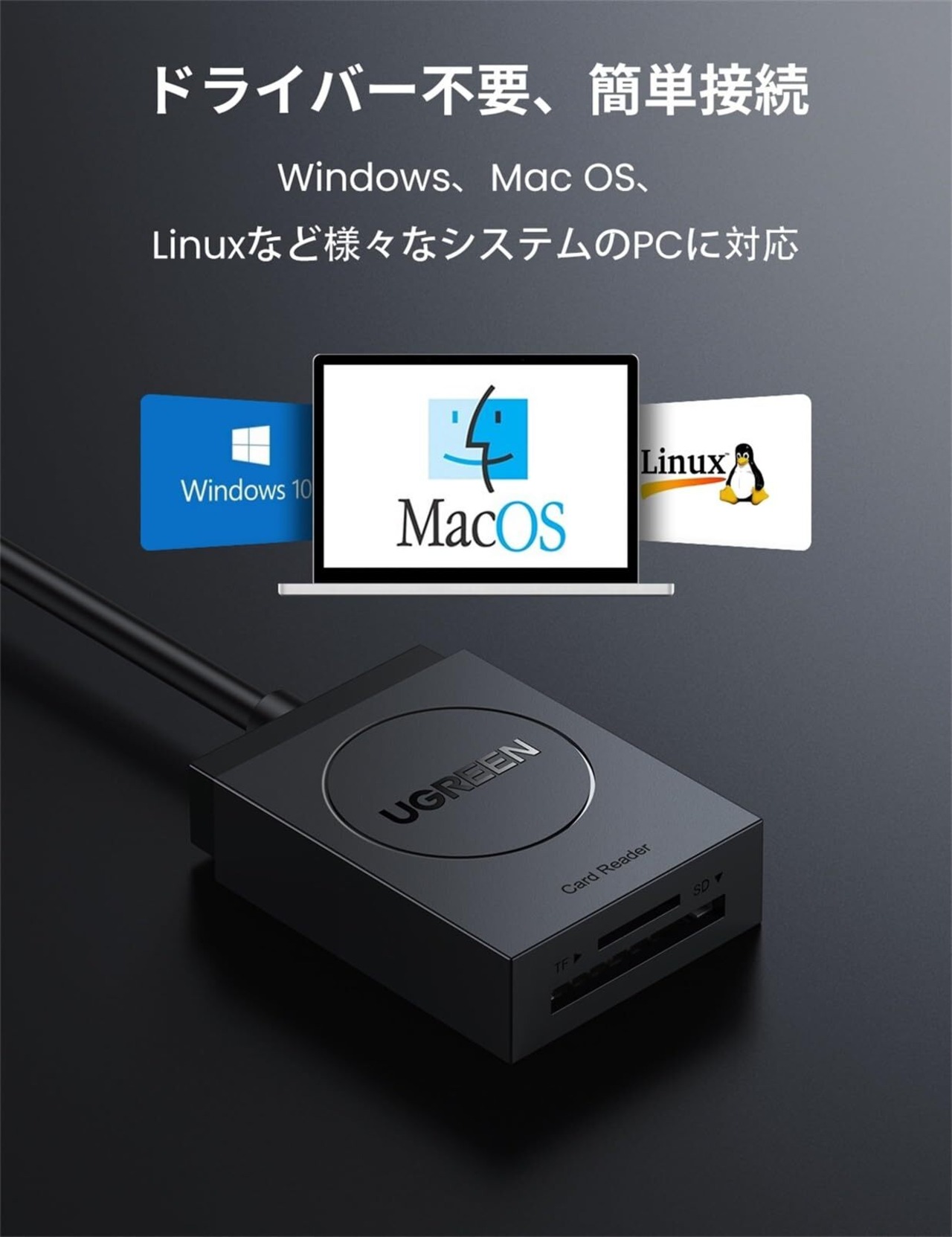 マルチシステム対応:幅広い互換性を持ちます。Windows XP / Vista / 7/8 / 8.1 / 10、Mac OS、Linux、Chrome OS等多種類のシステムに適用します。2TBまで大容量のSD/Micro SDカードをを対応します。