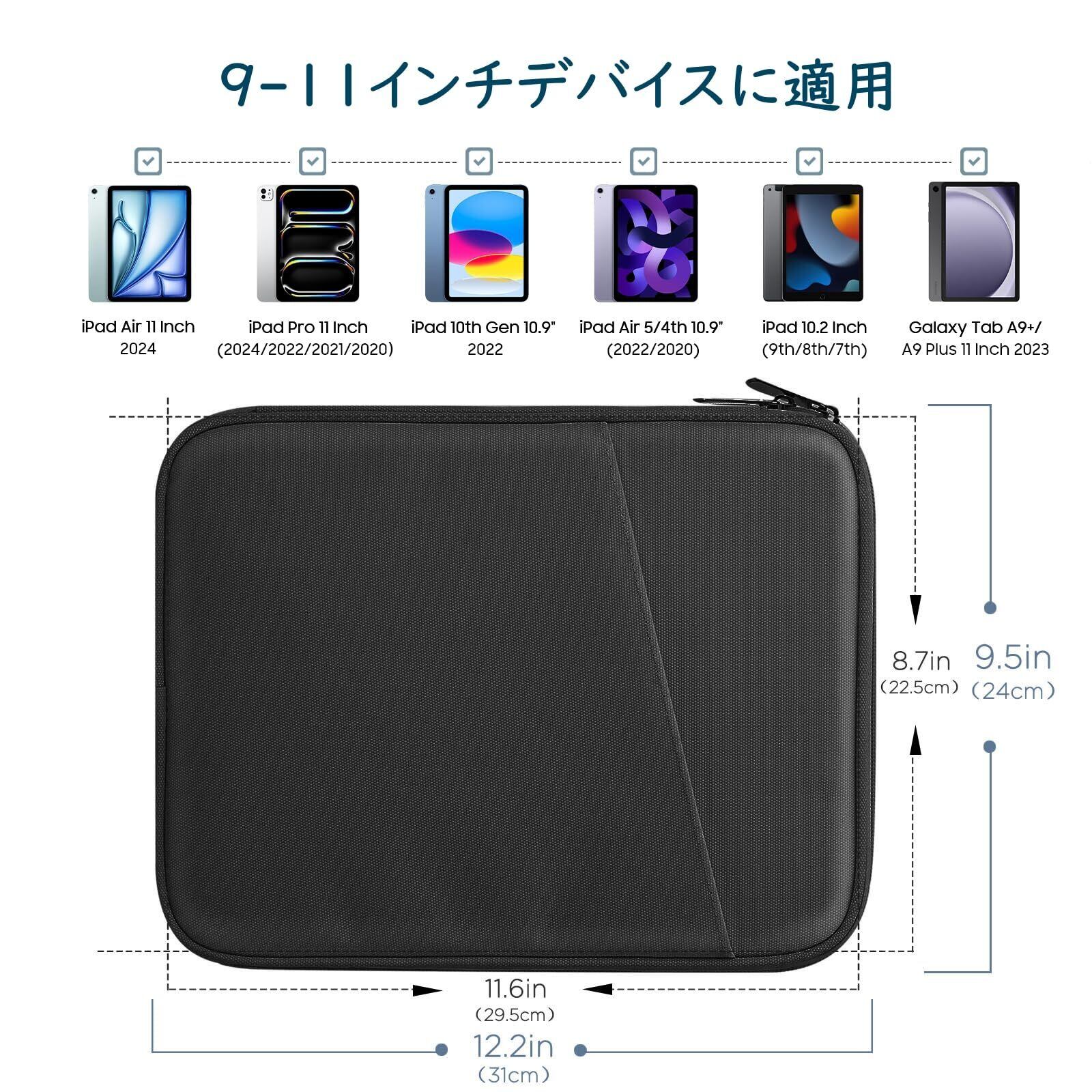 「9~11インチまでのデバイスに対応」当商品は外寸29.7*23.5*2.3cmで内寸27*20*1.5cmとなる主にタブレットを収納用保護インナーバッグです。iPad Air/Pro 11インチ(M3/M2)、iPad 第11世代(A16)、iPad 第10世代、Fire HD 10&10Plus、Chromebook、iPad Air 5/4 10.9、iPad mini7/6、iPad 9/8/7世代 10.2、iPad 9.7、Bmax I10 Plus/Bmax I9 Plus、Surface Go3/2 10.5/Go 10.0、Xiaomi Pad 5/6/Redmi Pad SE、Galaxy Tab A9+ など9~11インチまでのノート・タブレットPCに適用できます。