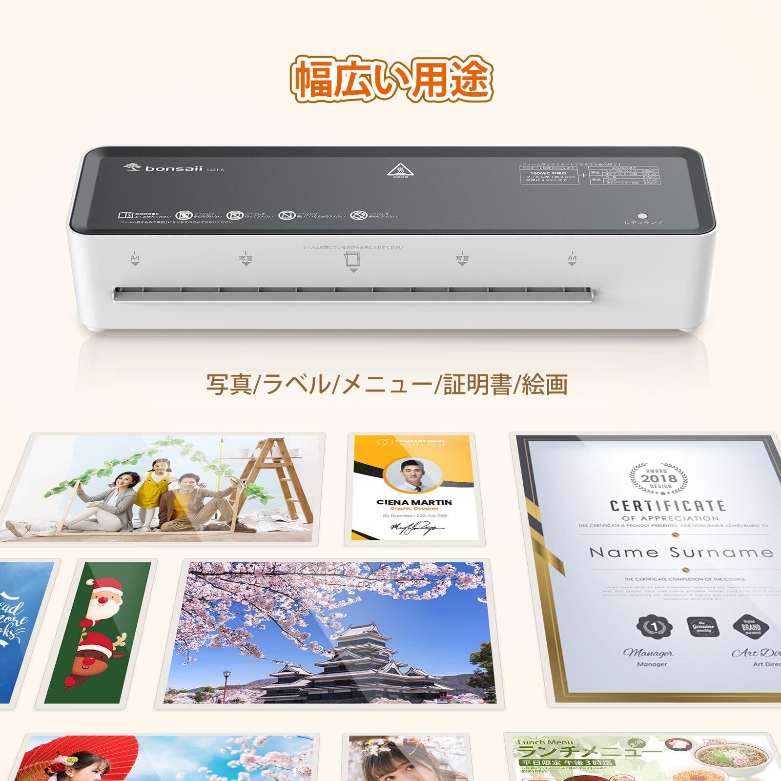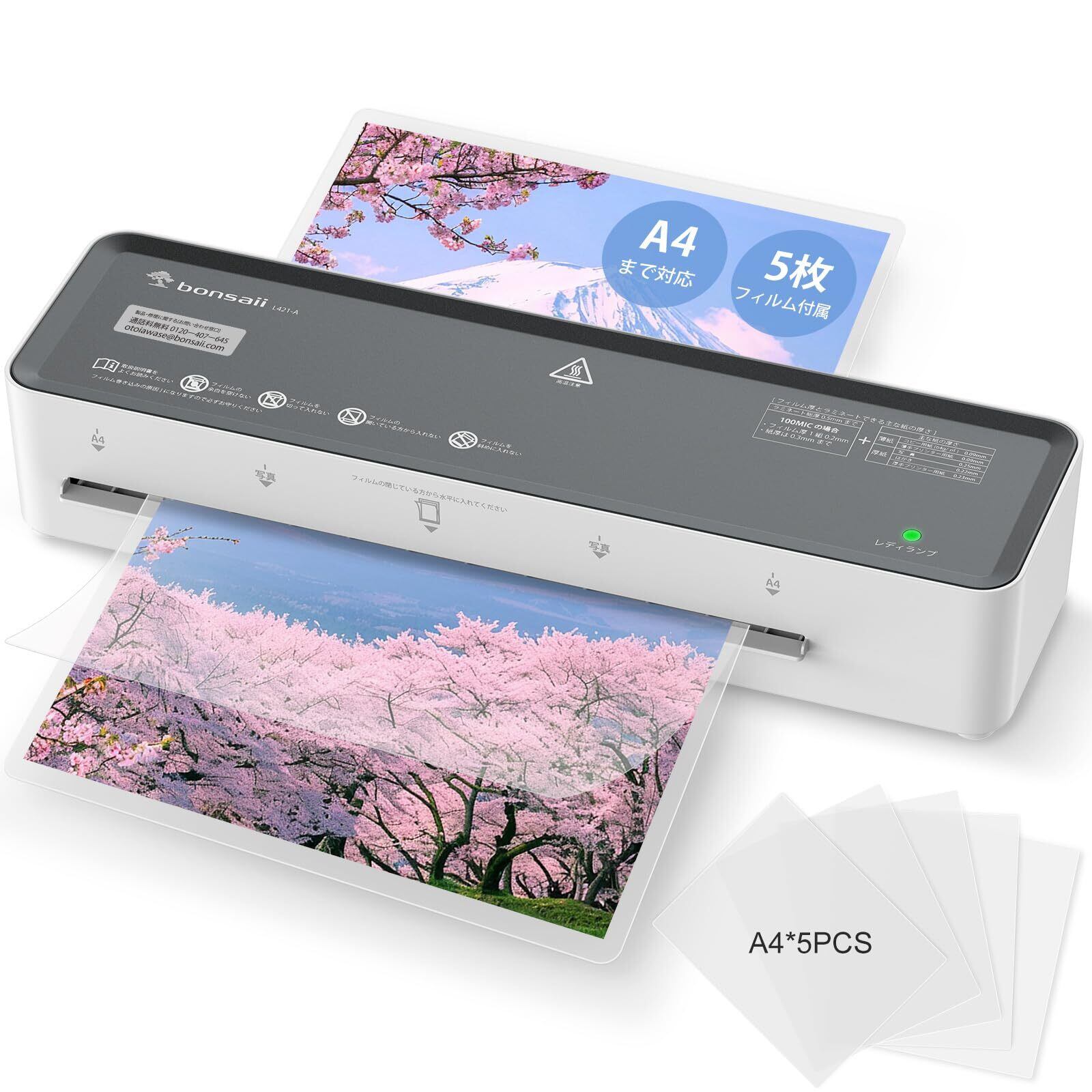 bonsaii ラミネーター 機械 A4対応 ラミネートフィルム 5枚付き 100μm対応 コンパクト 波打ち防止 気泡なし 連続作業可能 簡単操作 軽量 家庭用 L421-A