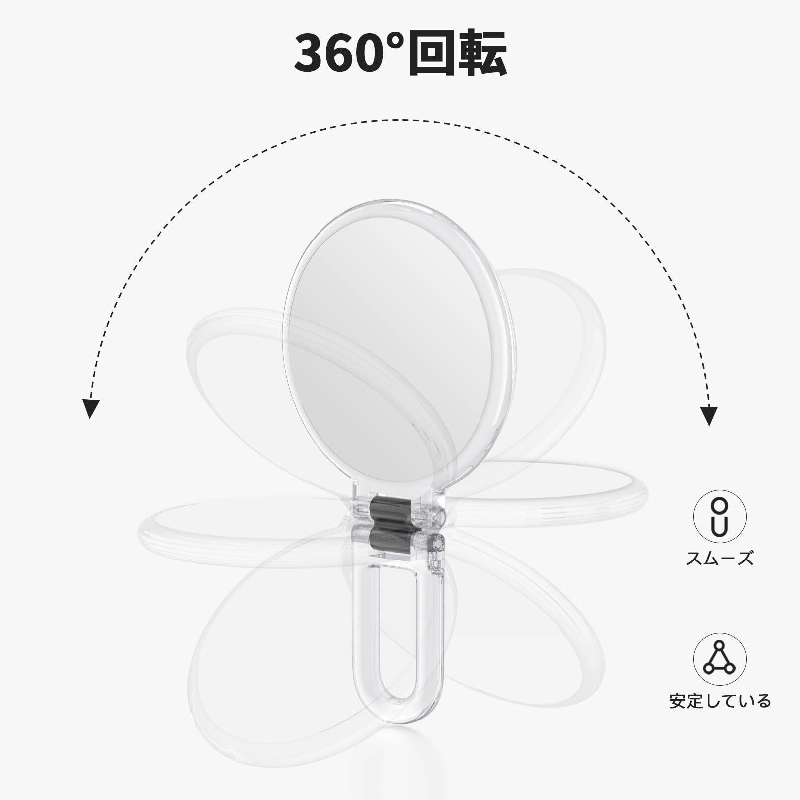 360°回転可能なハンドミラー:調整可能なハンドルで、拡大鏡 メイクは両側に折りたたむことができ、360度回転させることができます。異なる角度に調整するのが便利です。手鏡、テーブルミラー、吊るし鏡として使用できます。日常使用や旅行に最適です。