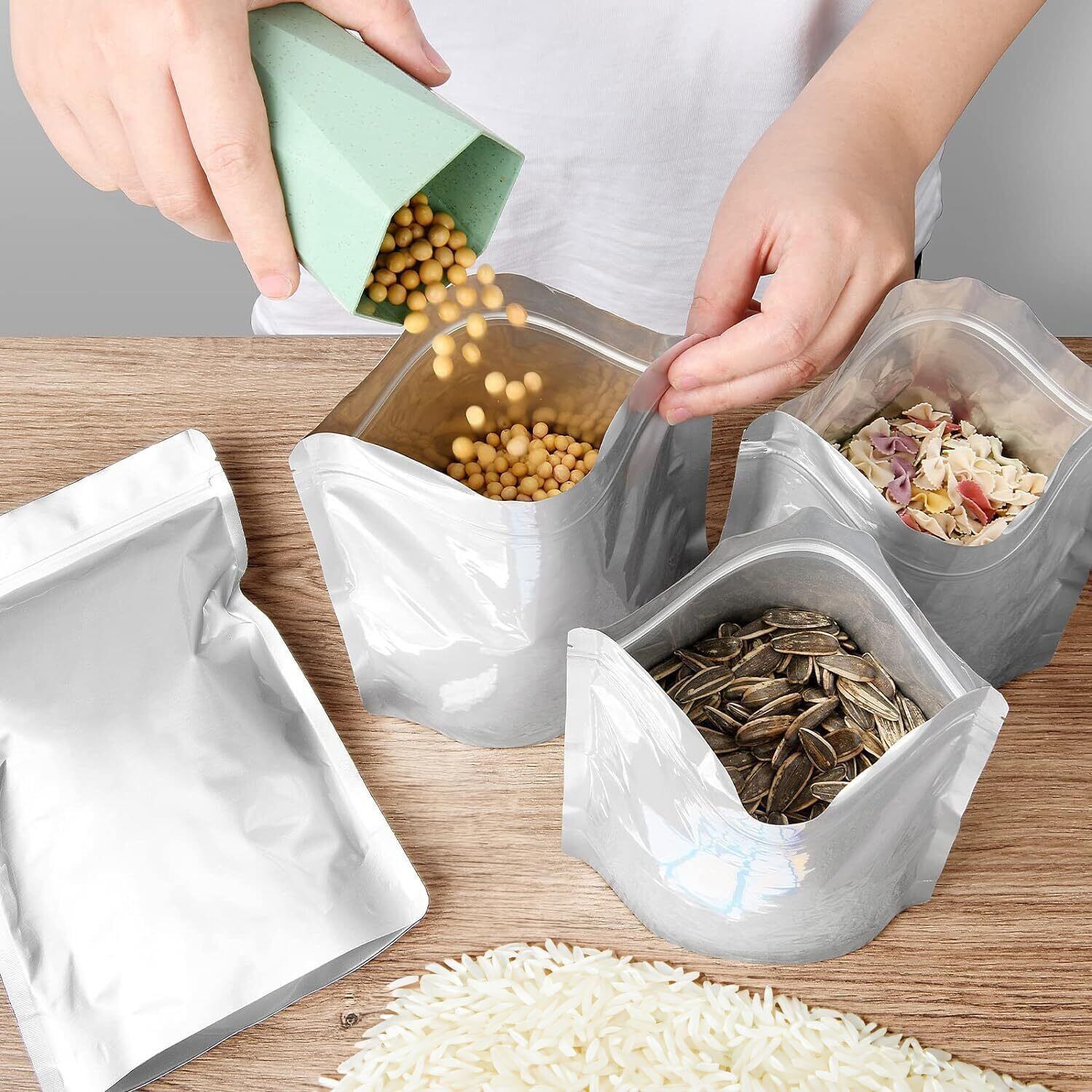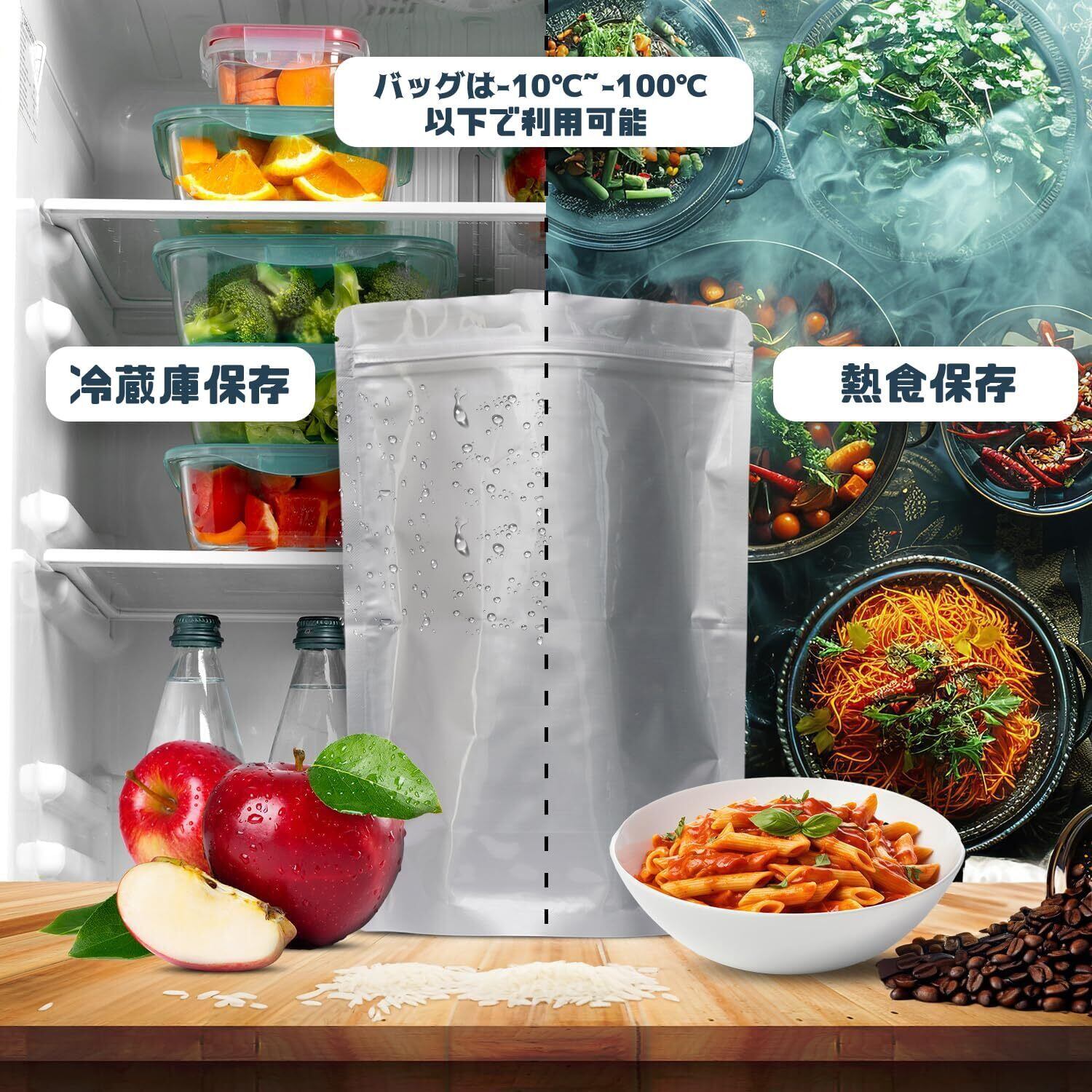 【省スペース設計】袋タイプで場所を取らず、マチ付きで自立します。冷蔵庫内でもスッキリ収納でき、他の乾物にも対応します。