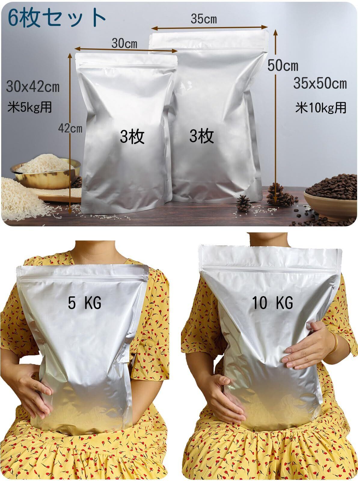 お米保存袋 米袋 5KG 10KG セット お米 保存容器 ジッパー付き アルミ袋 特大 チャック付き 遮光袋 お米いれ容器 冷蔵庫保存 密閉袋 大(6セット:5kg-3枚;10kg-3枚)