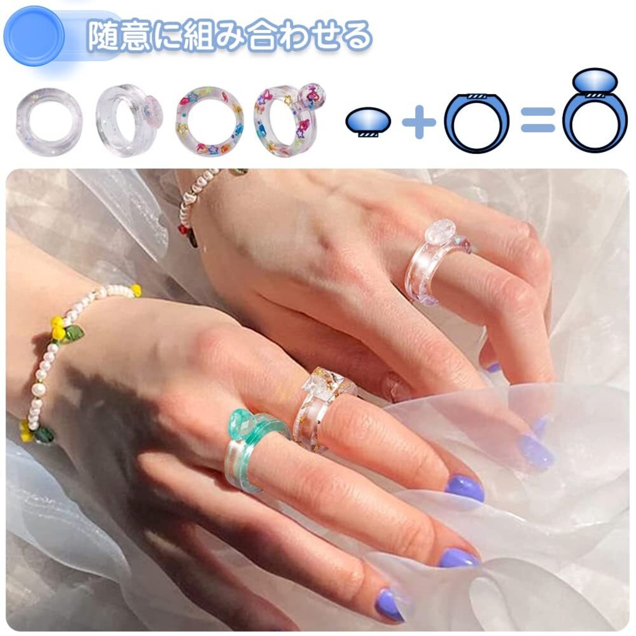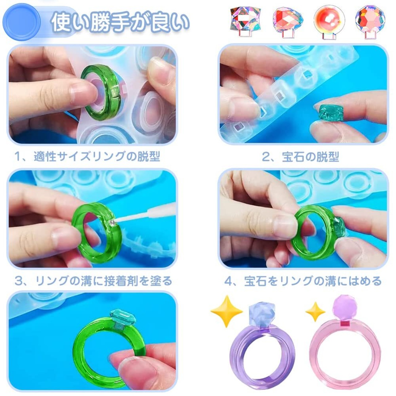 簡単な使い方:1.ジャストサイズのリングを外す 2.石を外す 3.リングの溝に接着剤を塗る 4.リングの溝に石をはめ込む 5.世界に一つだけのダイヤモンドリングが完成する。半透明の型なので、仕上がりを確認しながら工作ができ、気軽にDIYを楽しめます。