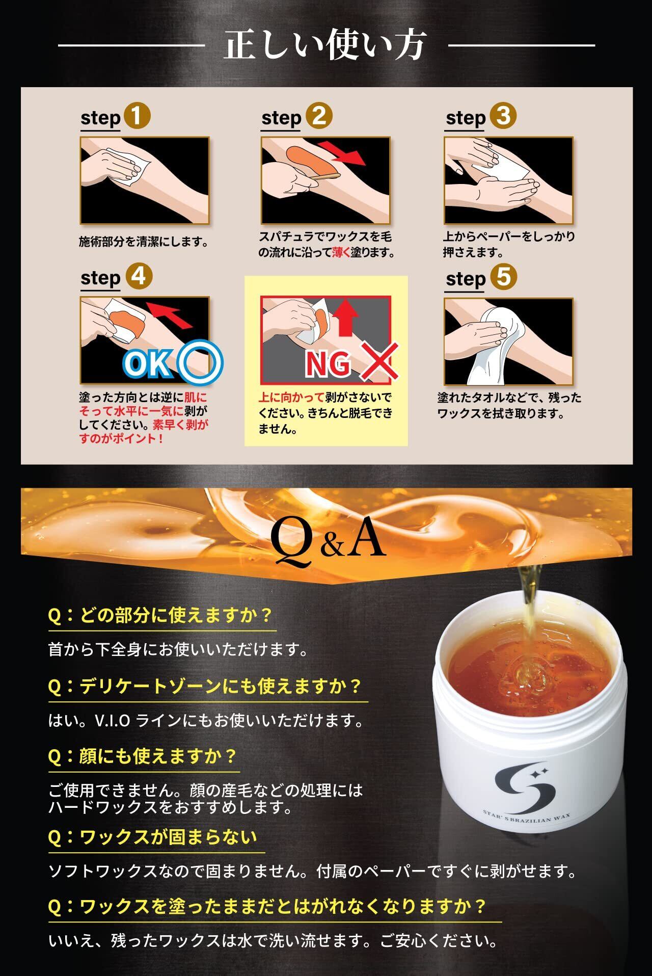 【使用用途】デリケートゾーンを含めた首から下の全身にお使いいただけます。お顔へのご使用はご遠慮ください。【ご注意】ご使用の際は必ず説明書をお読みください。当製品はソフトワックスになります。固まらず、付属のペーパーを貼り付け剥がすことで待ち時間無しで、手早い処理が可能です。固まるブラジリアンワックスをお求めの際はハードワックスをお探しください。