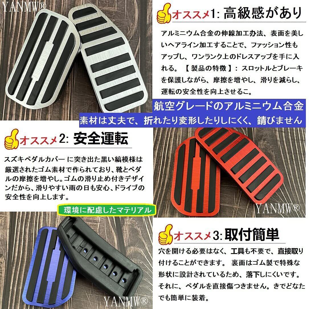 【安.全運.転】: ペダルカバー アルミ合金とゴム製。アルミニウム合金素材を採用することより、軽量性、堅牢性で、耐久性があるだけでなく、美観性も良好です。製品中央に突き出た黒い縞模様は厳選されたゴム素材で作られており、靴とペダルの摩擦を増やし、滑りやすい雨の日も安心、ドライブの安全性を向上します。人体工学による設計、違和感のない装着感でまるで純正のような印象で運転の楽しさもUPします。【パッケージ内容】:適合スズキ専用アクセルペダルカバー* 1&ブレーキペダルカバー* 1