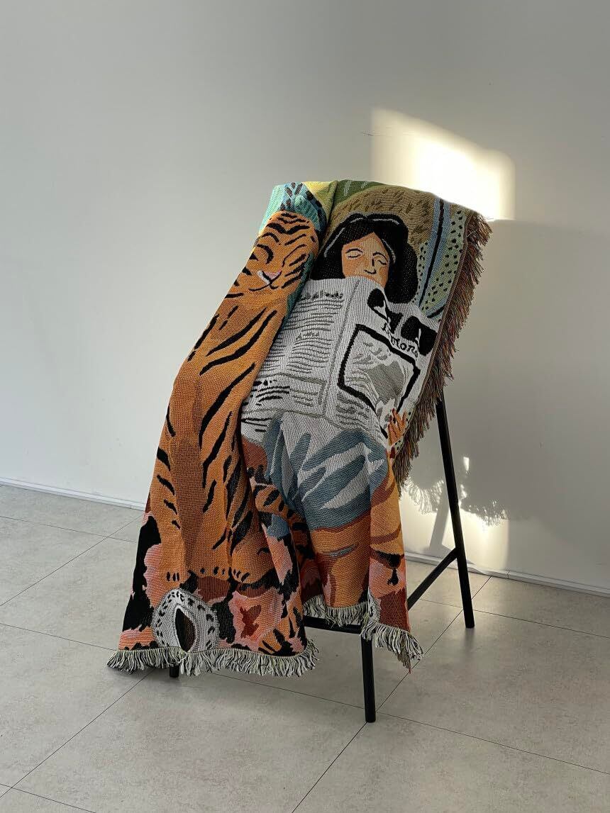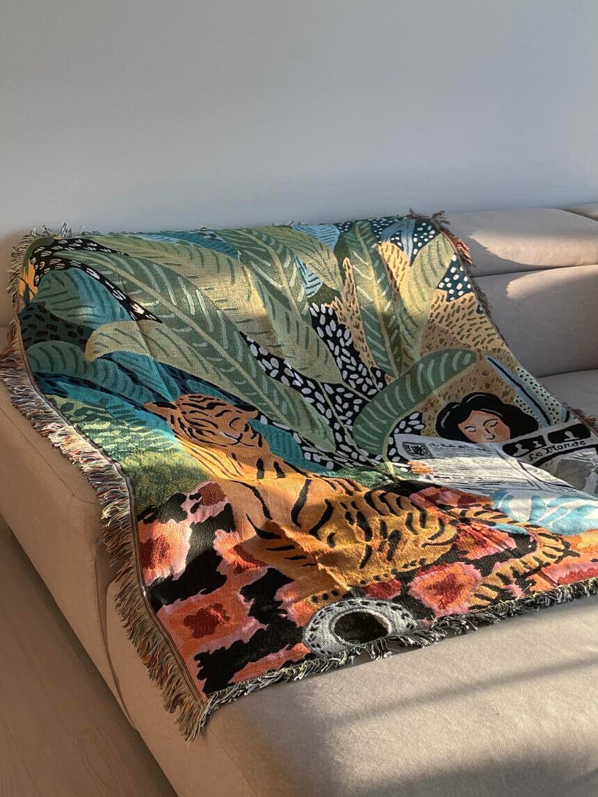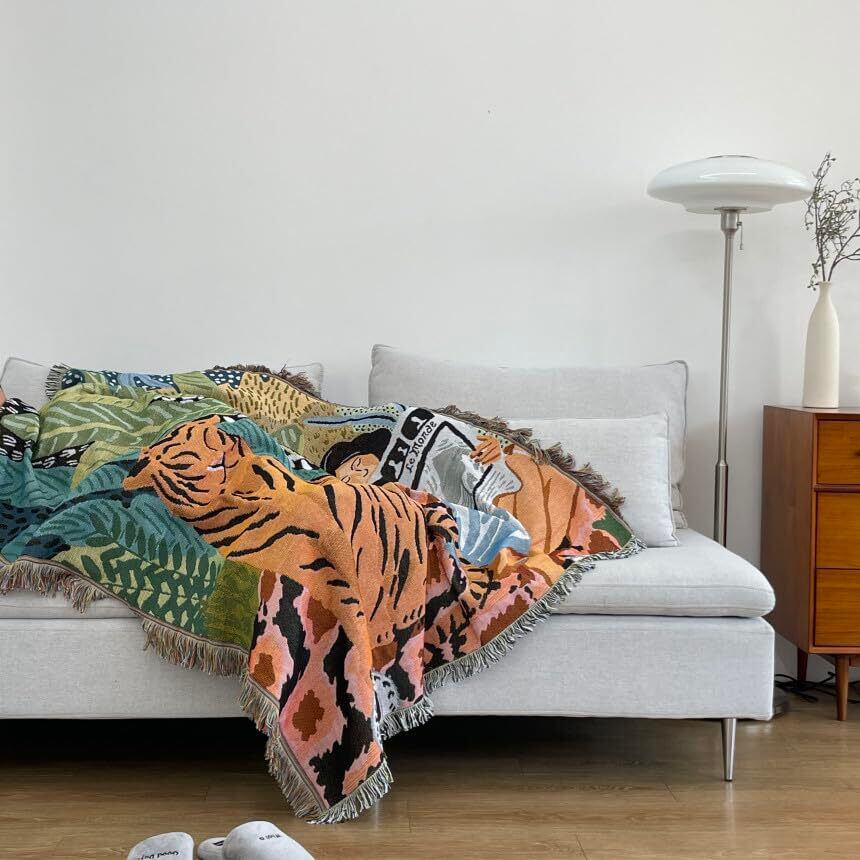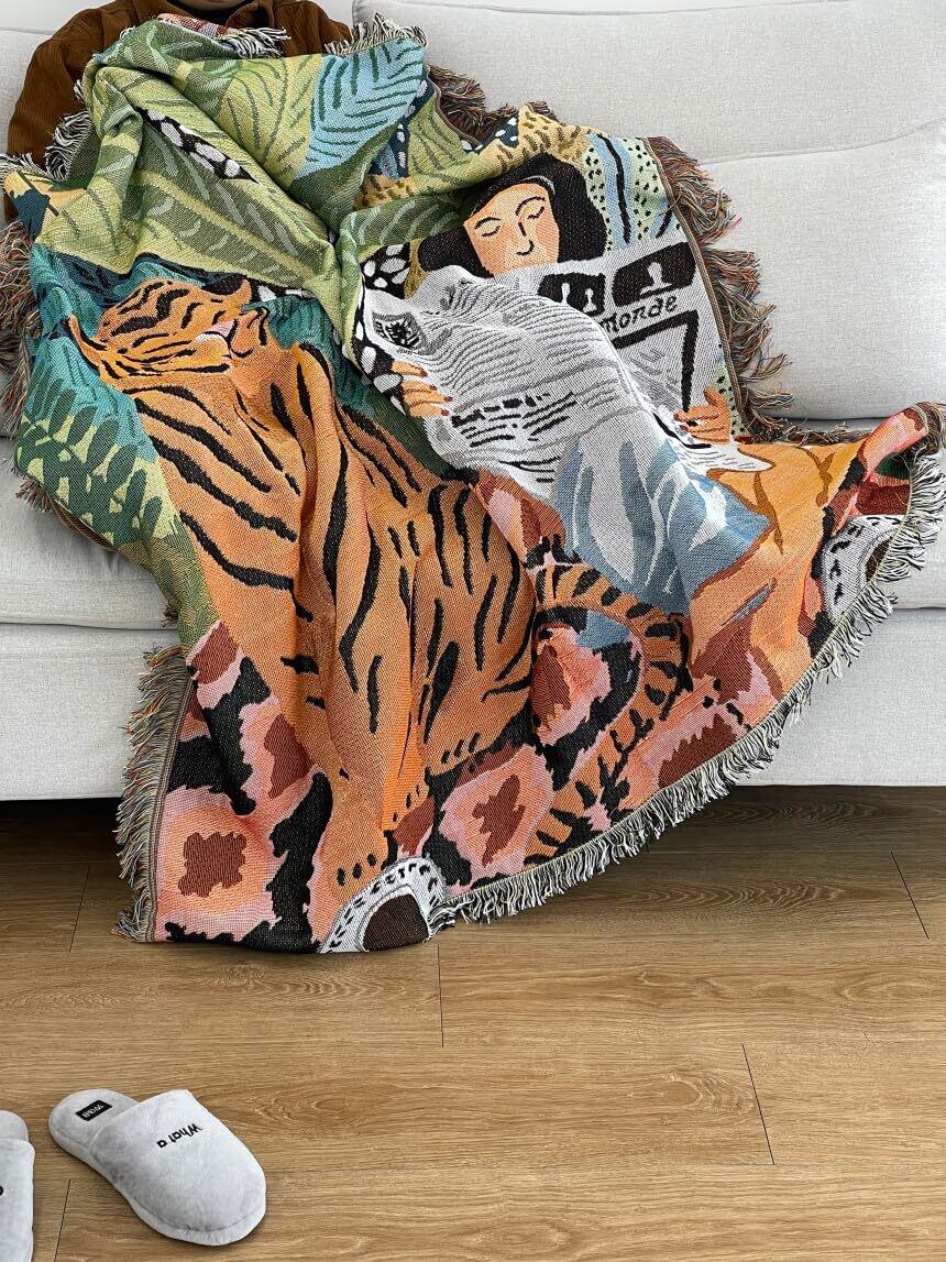 Peel Forest トロピカル南国風植物 ,アメリカン雑貨 タイガー マルチカバー ラグ おしゃれ かわいいトラと女の子 ブランケット 130X160cm………