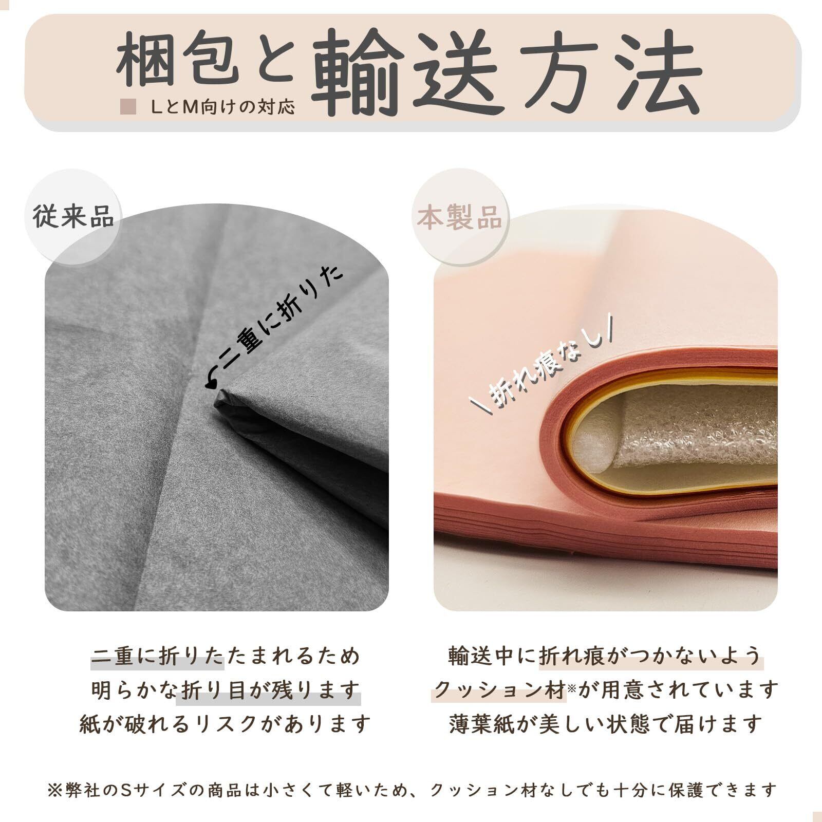 【折れ痕なし】お客様のご要望に応じて、大きなサイズのラッピングペーパーには、輸送中に折れ痕がつかないよう特別なクッション材が用意されています。これにより、薄葉紙が美しい状態のままでお手元に届きます
