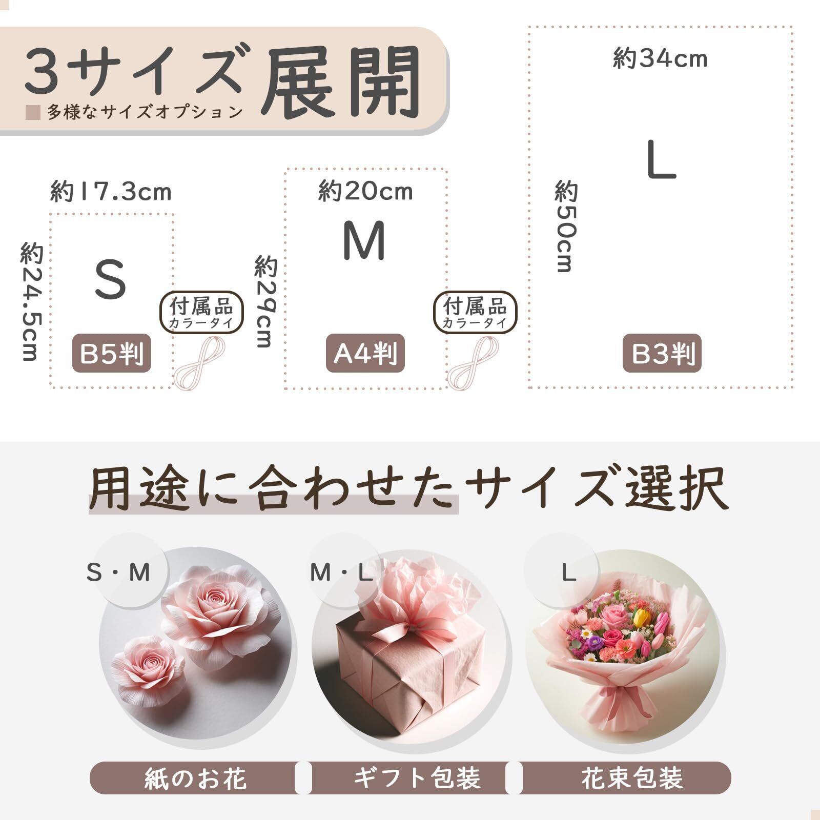 【3サイズ展開】SとMサイズは折り紙や花作りに適しており、Lサイズは花束やギフト包装紙に最適です。Sサイズ:17.3x24.5「B5判」、Mサイズ:20x29「A4判」、Lサイズ:34x50「B3判」