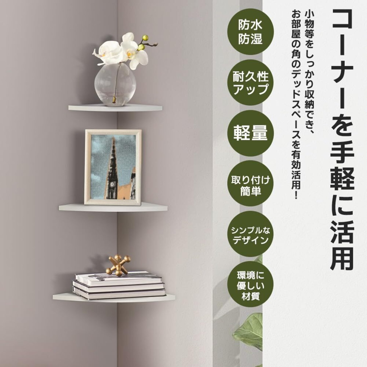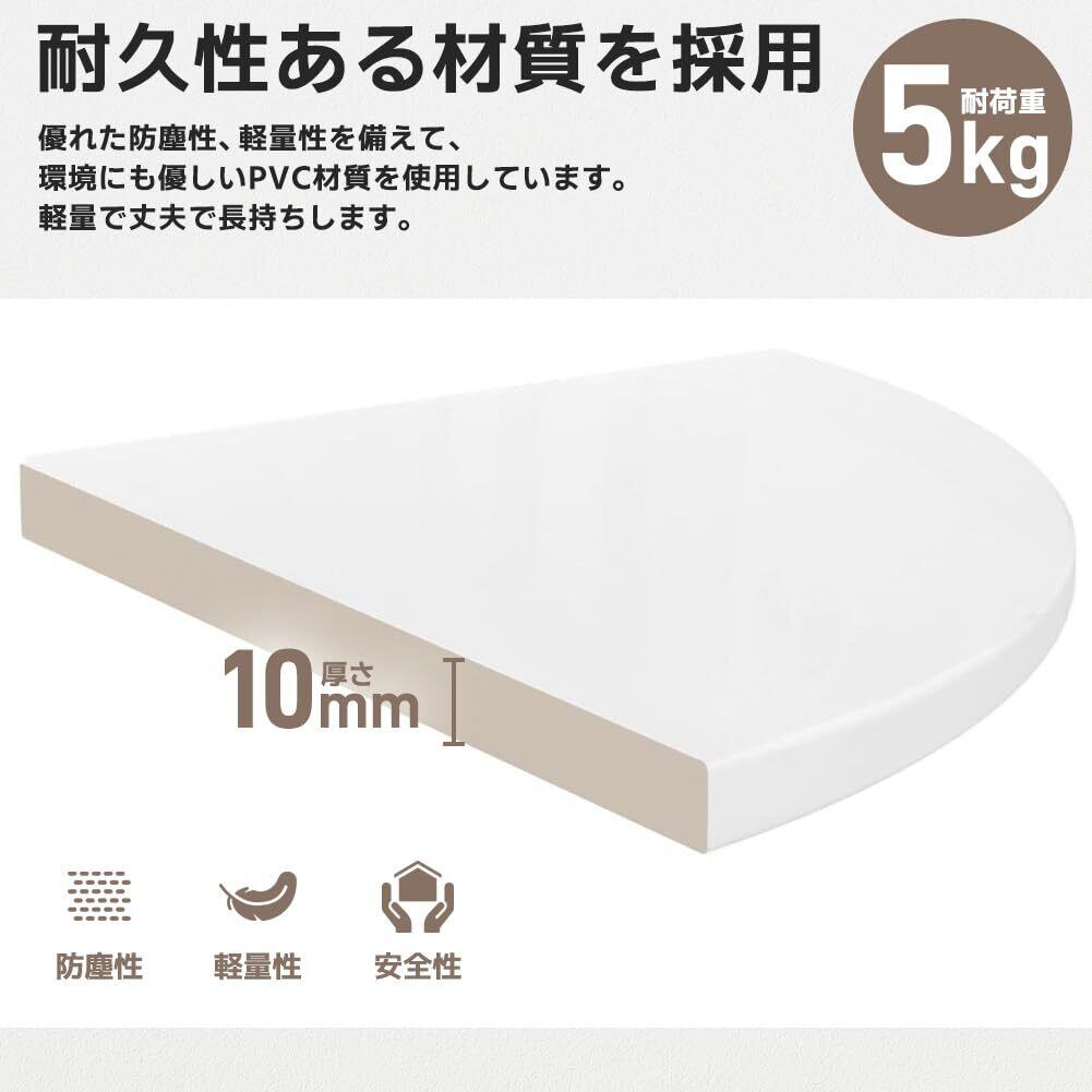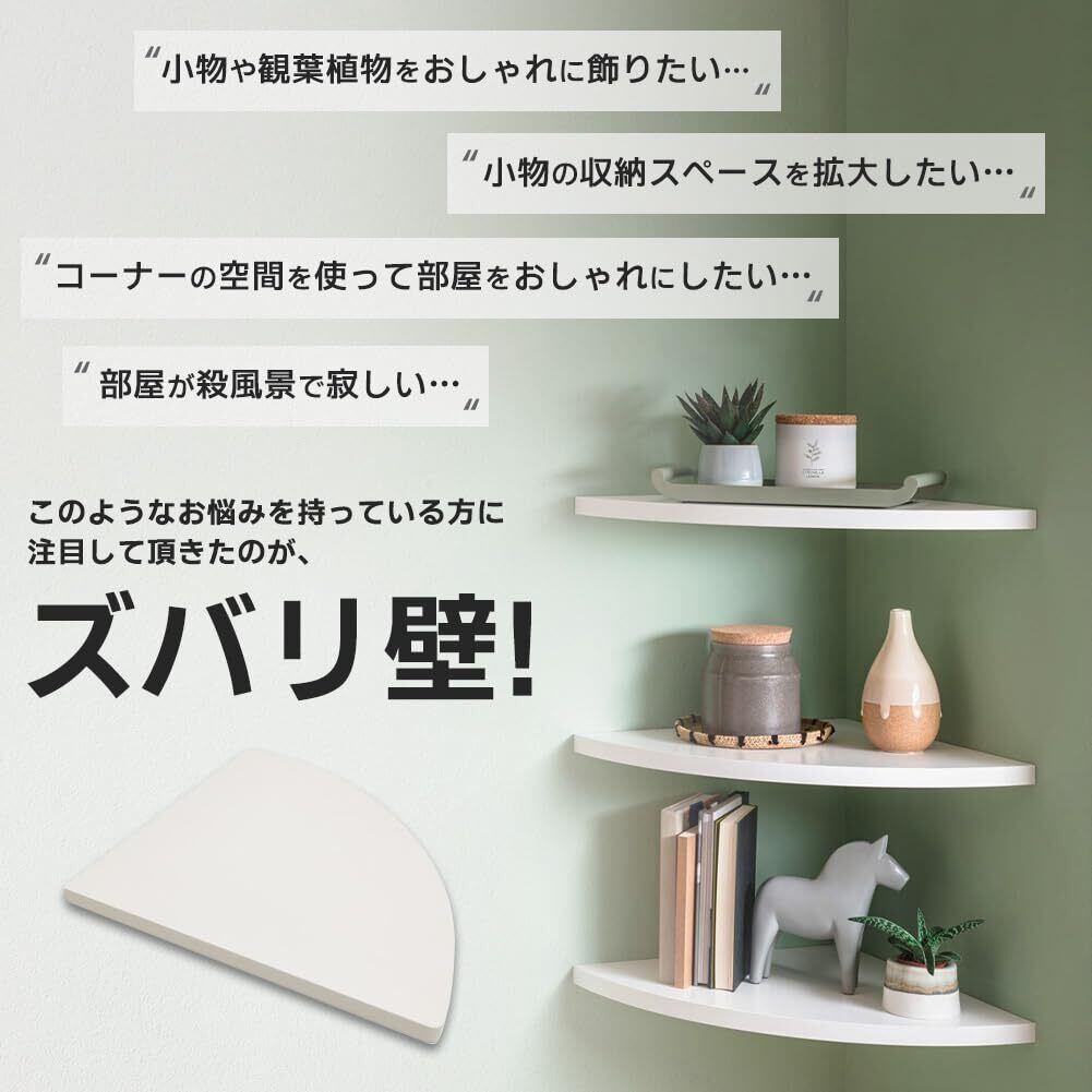 【シンプルなデザイン】90度の角地に取り付けできる飾り棚です。シンプルなデザインが特徴の壁掛け棚はどんなインテリアにも自然にマッチします。整理された空間を演出し、家全体にスタイリッシュな雰囲気を加えます。リビングや、洗面所、お手洗いなどのコーナーにも。場所を取らずに、ちょこっと飾りたい時に便利です。