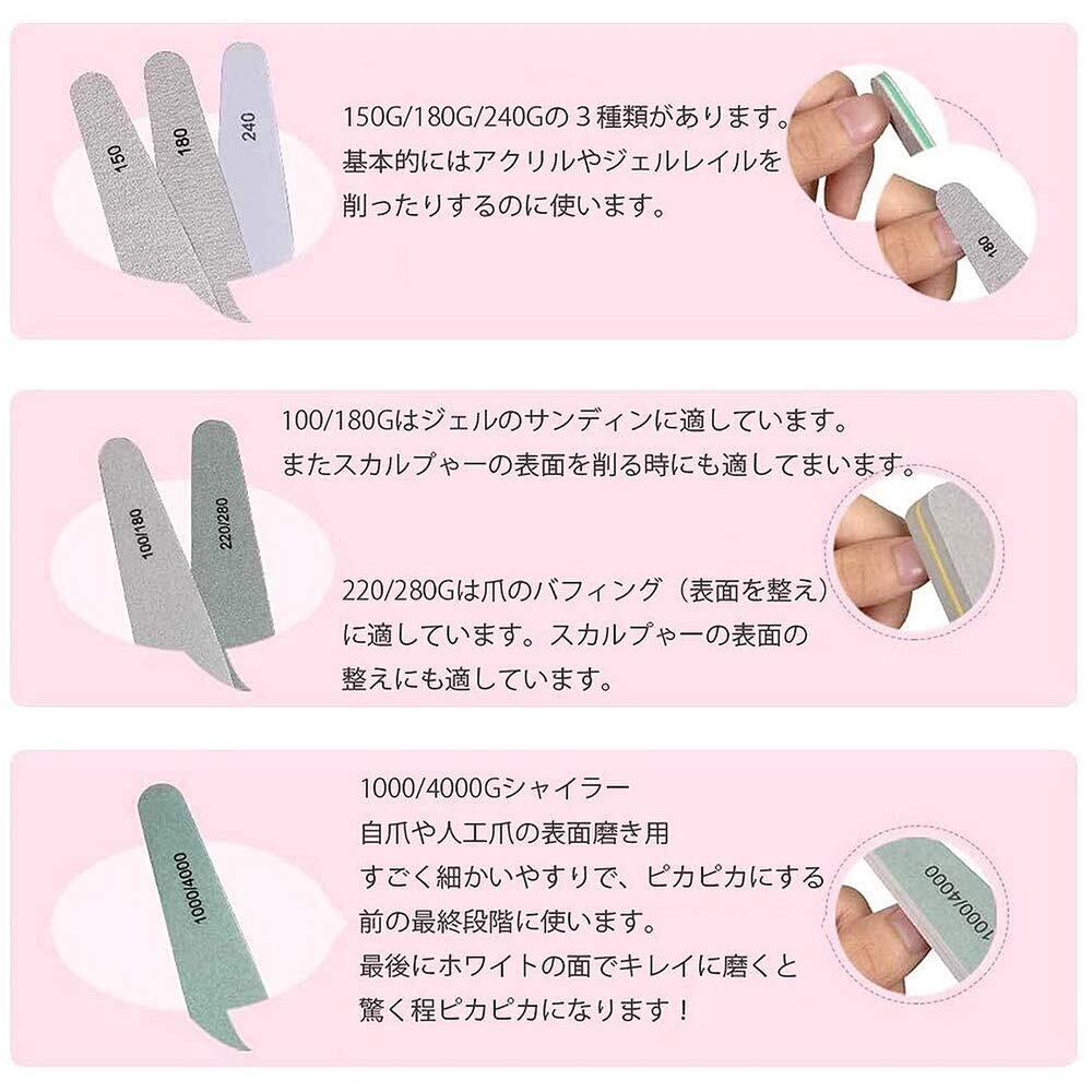 【スポンジバッファー2種類】100/180グリットはジェルのサンディンに適しています。またスカルプゃーの表面を削る時にも適してまいます。220/280グリットは爪のバフィング(表面を整え)に適しています。スカルプャーの表面の整えにも適しています。