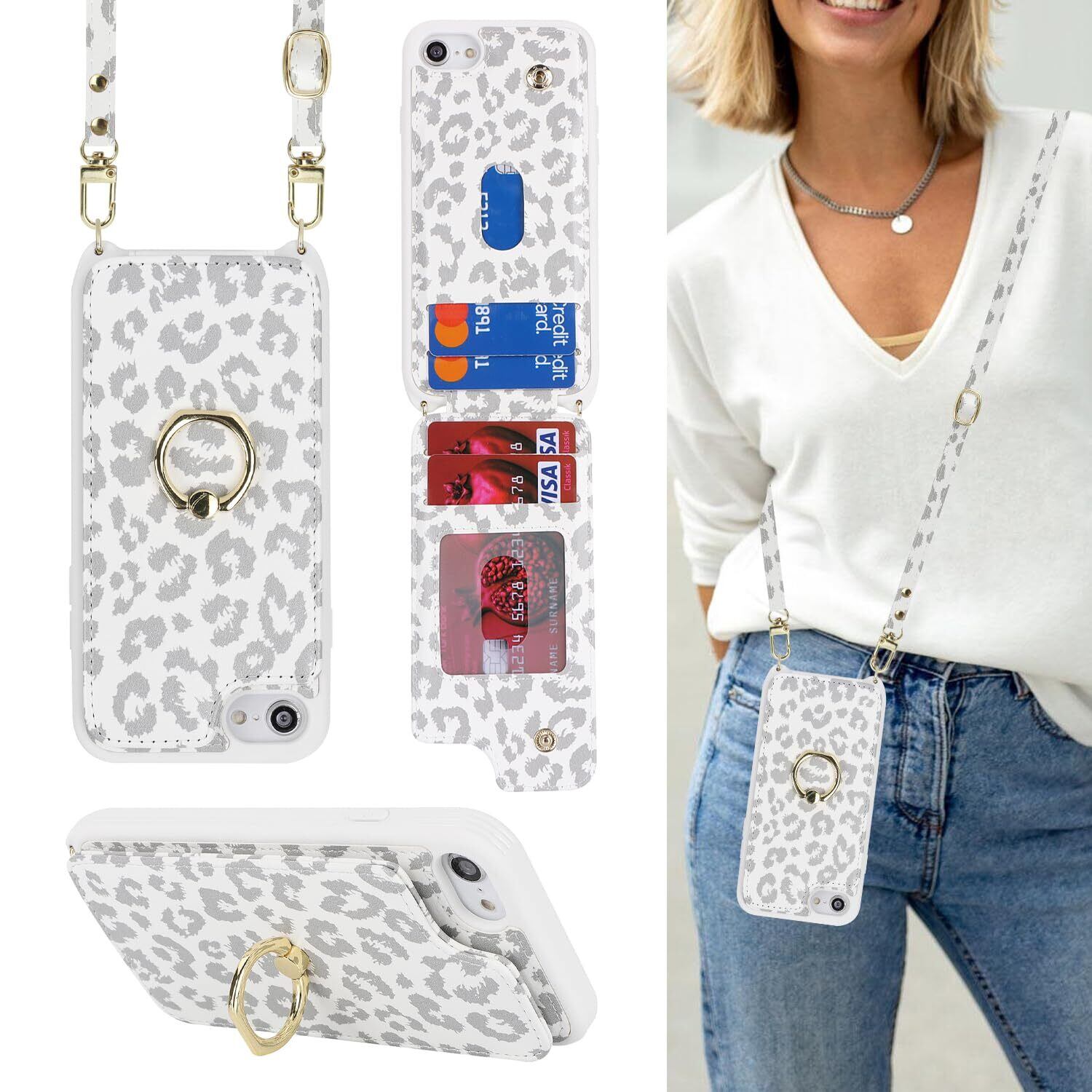 Cavor iPhone7 iPhone8手帳ケースiPhoneSE 第2/3世代 iPhoneSE2 SE3 SE 2022 ケース手帳型iPhoneSE2 スマホ ケースショルダー クロスボディ肩掛け 首かけ 斜めがけケース背面ポケット付きiPhoneSE3財布型カードケース【上下開】アイホン8 カード収納ケース【RFID機能】財布型case 360°回転リング横置 磁気機能 -白ヒョウ柄