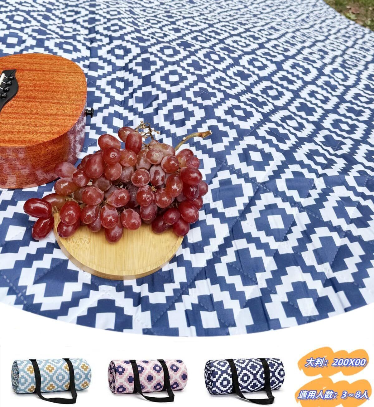 【大判レジャーシート】:家族や友人と外出する際に使える大きなサイズのピクニックシート。展開サイズ(約):幅200cm×奥行200cm、収納サイズ(約):38cm×16cm×16cm。2~3人での少人数で使用する場合は、寝転んだり広々とくつろげるサイズ感です。通常4~8人が座れる。