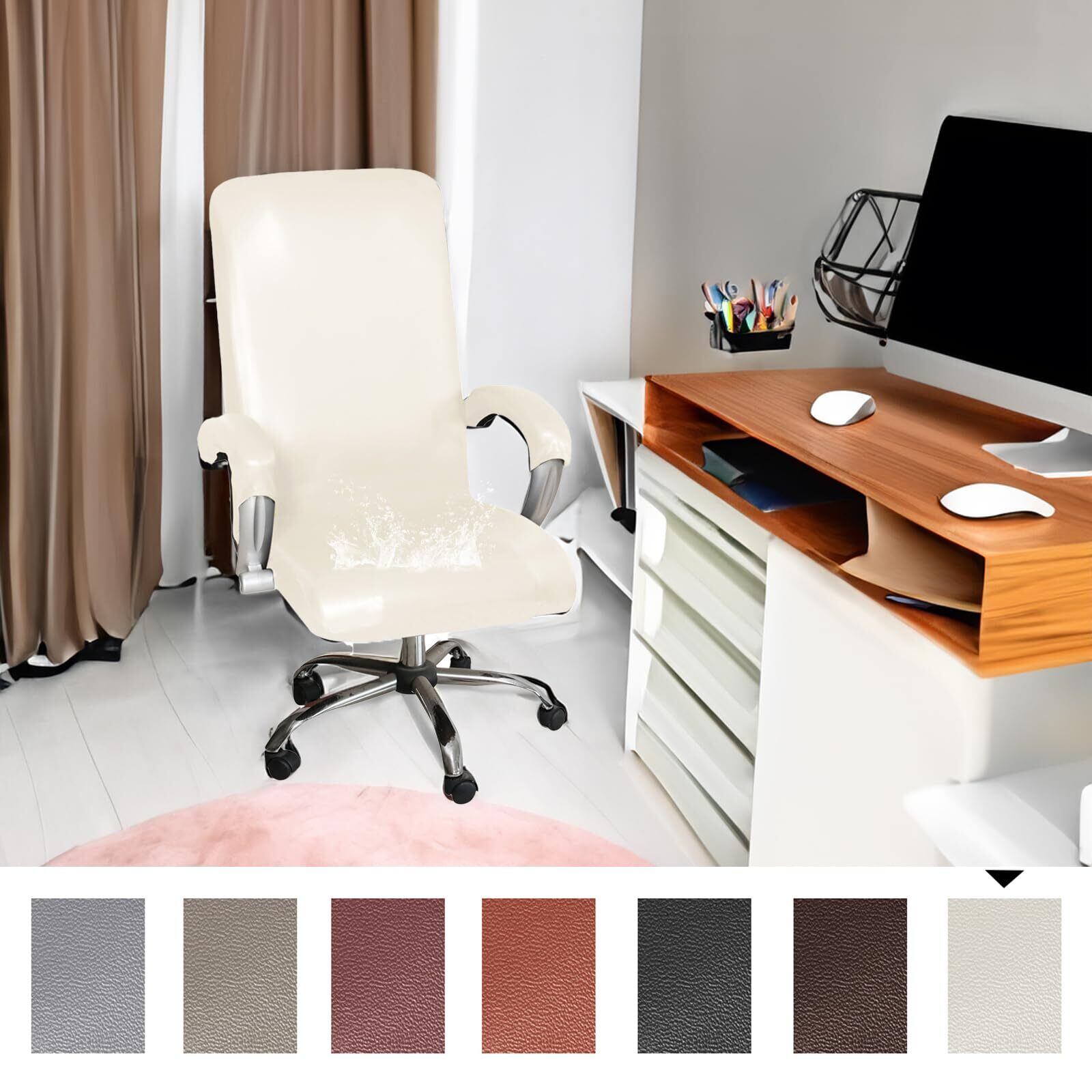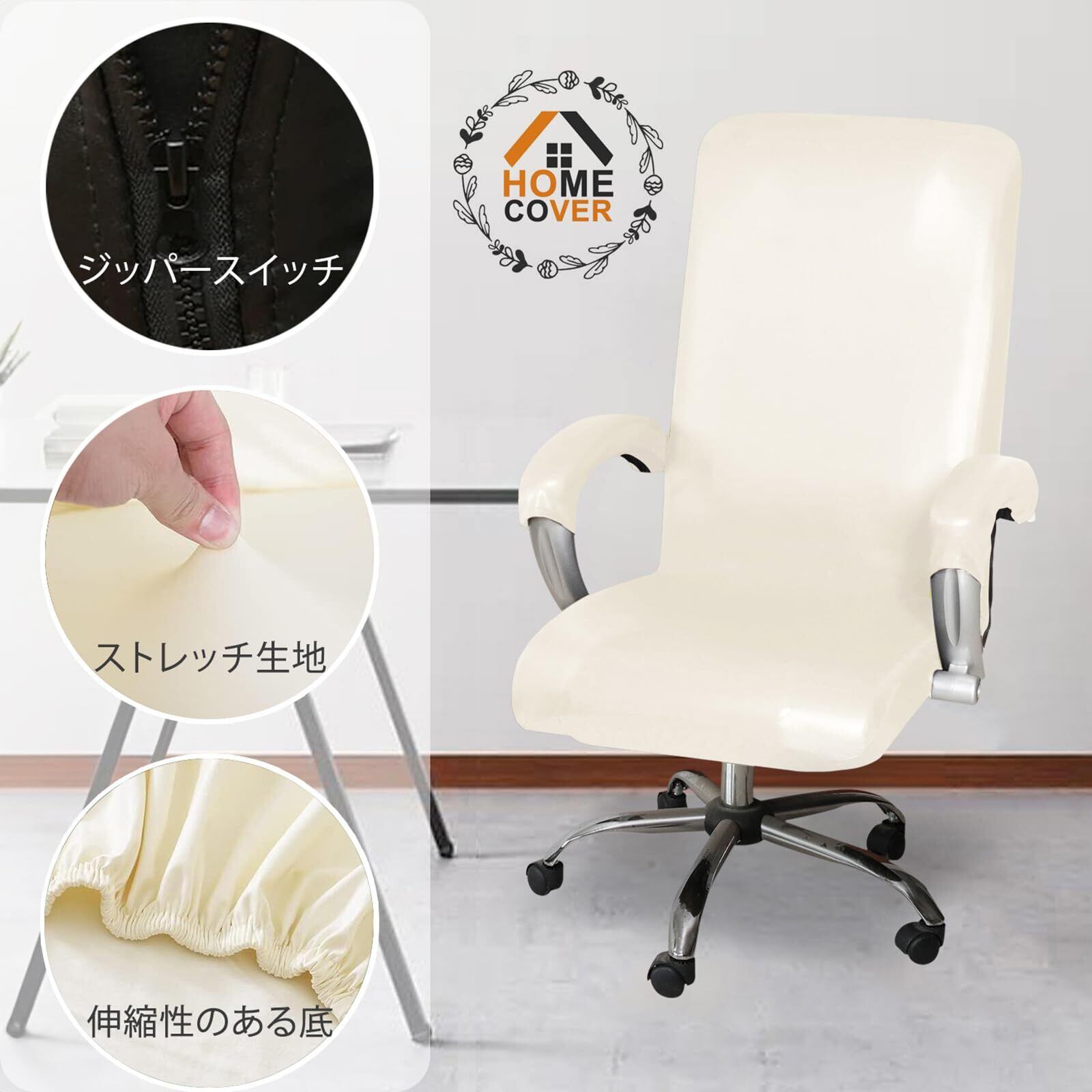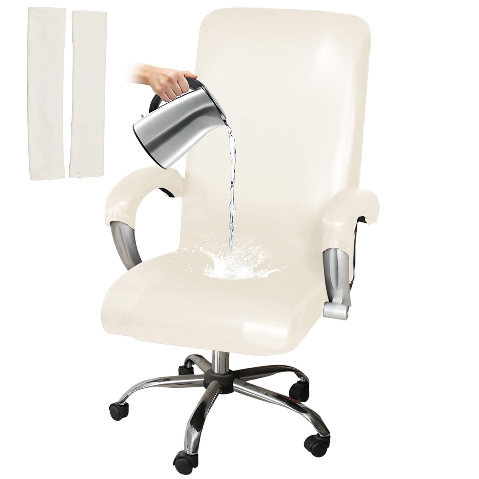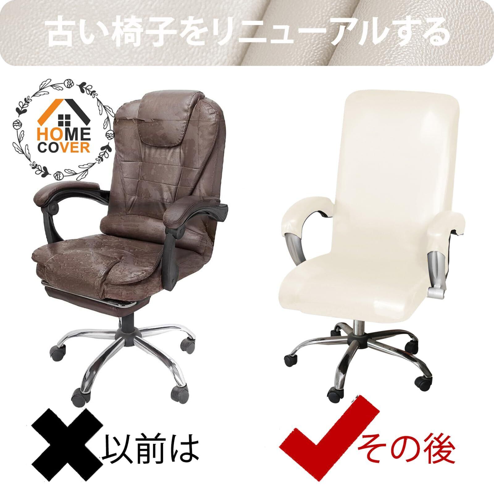 HOMECOVER ストレッチ オフィス椅子カバー 撥水, ユニバーサル PU レザー 回転 パソコンチェアカバー 付 アームレストカバー 取り外し可能 チェアカバープロテクター-白-Large