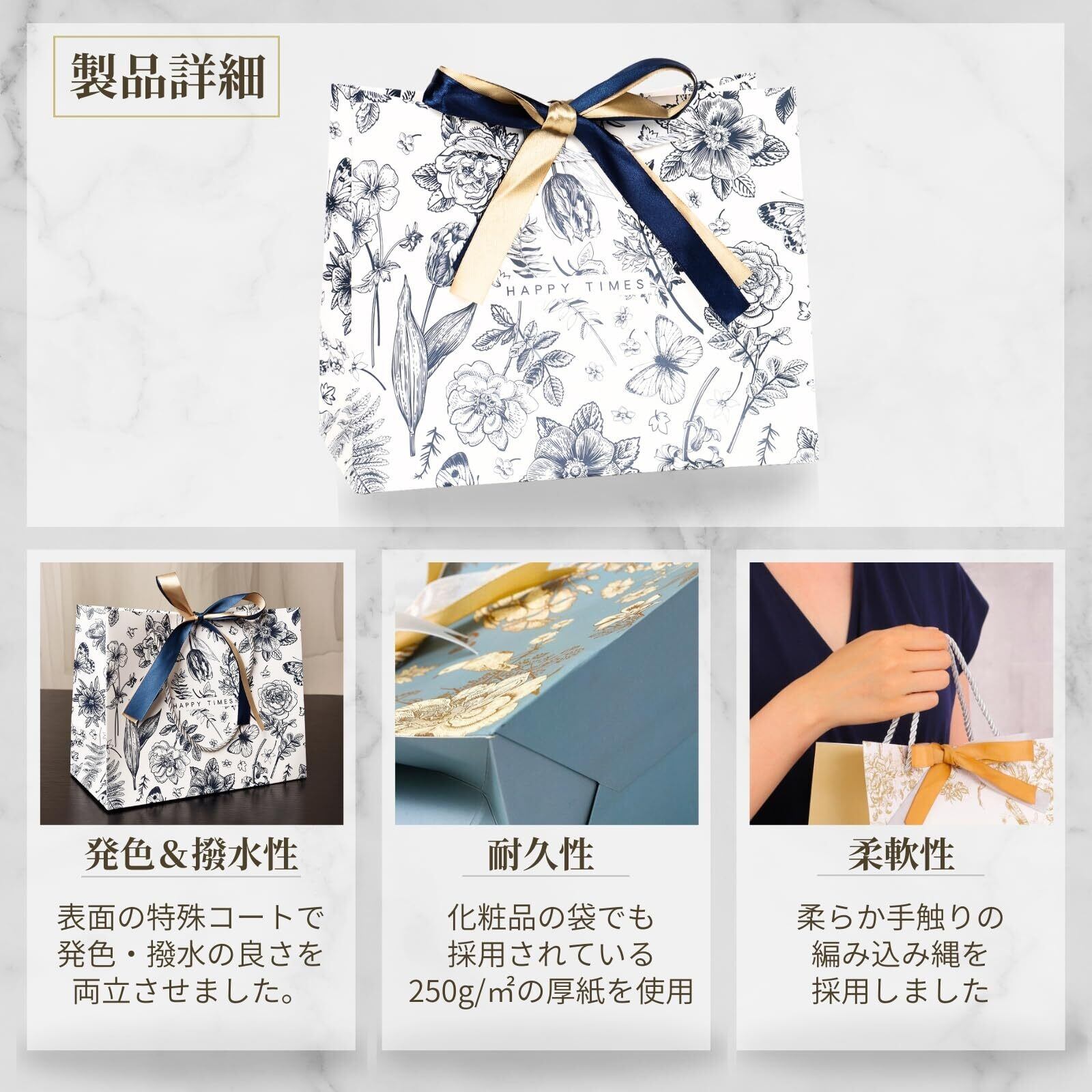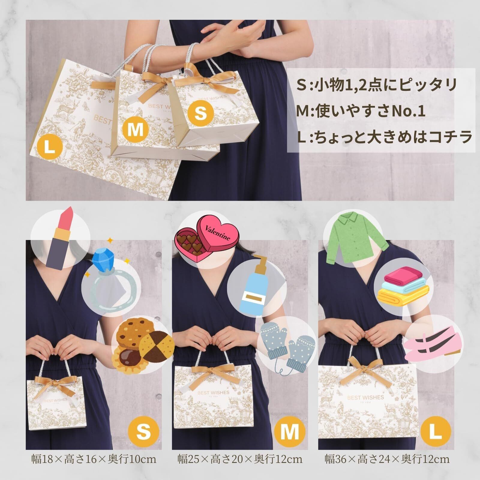 【商品内容】3枚入りラッピング袋(6デザインx3サイズ展開)Sサイズ(小):幅18*高さ16*奥行(マチ)10cm、Mサイズ(中):幅25*高さ20*奥行(マチ)12cm、Lサイズ(大):幅36*高さ24*奥行(マチ)12cm、 リボン各2色 計6本、サンクスタグ 3枚、 取付用ひも 3本