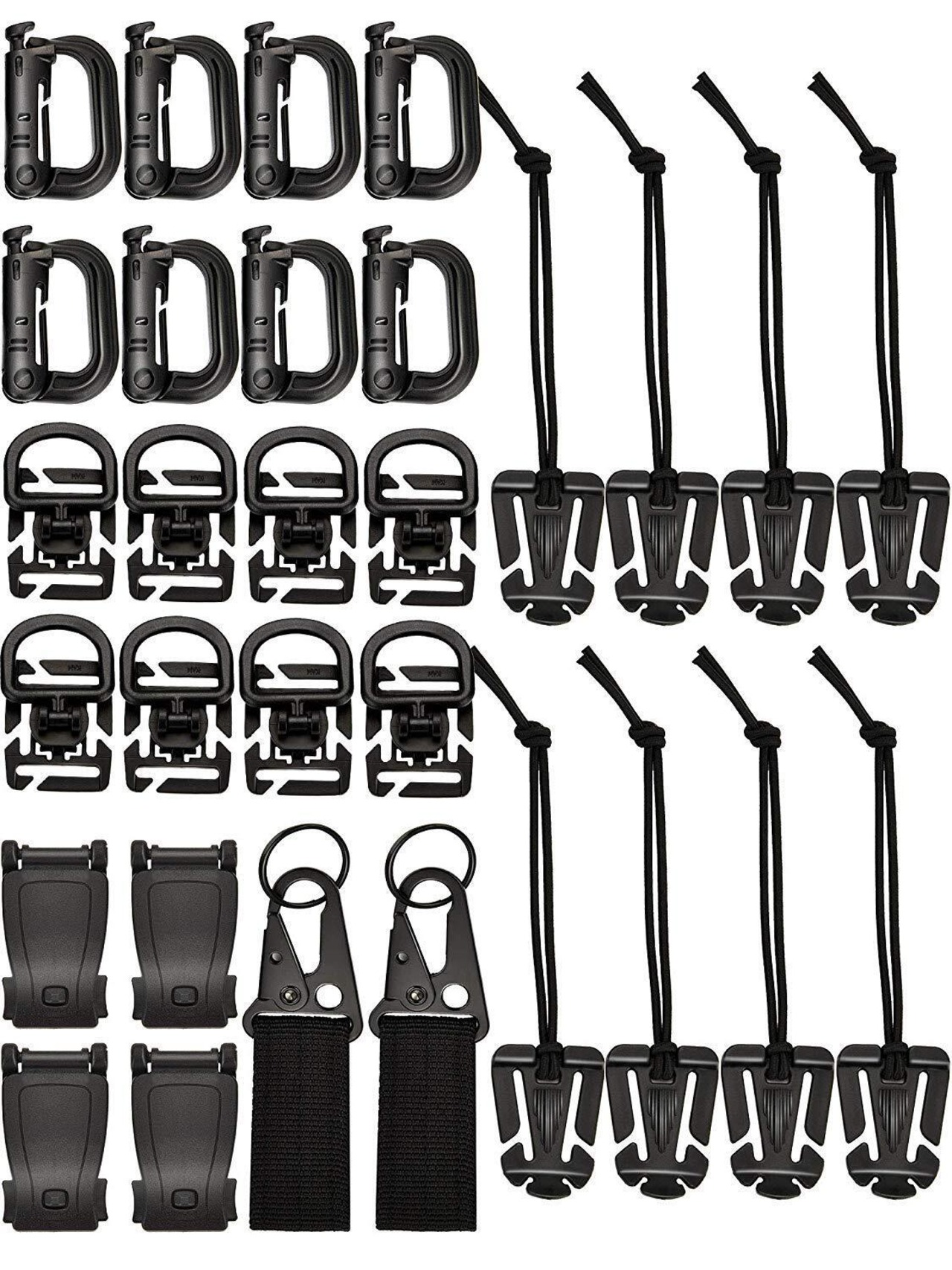 5種類全部35個セットでコスパ抜群 パッケージ内容:Dリング*8+Dリング 360 回転 フック ホルダ*8+バックル クリップ *4+ベルクロ式ベルトキーホルダー*2+ ウェブドミネーター*8 経済的、軽量で耐久性が高く、バックパック用