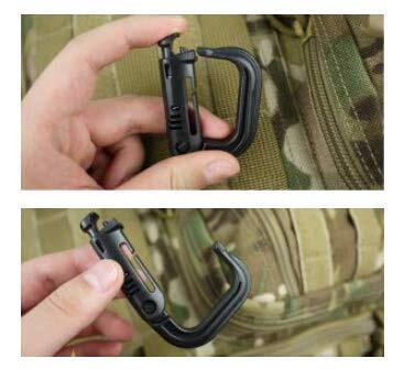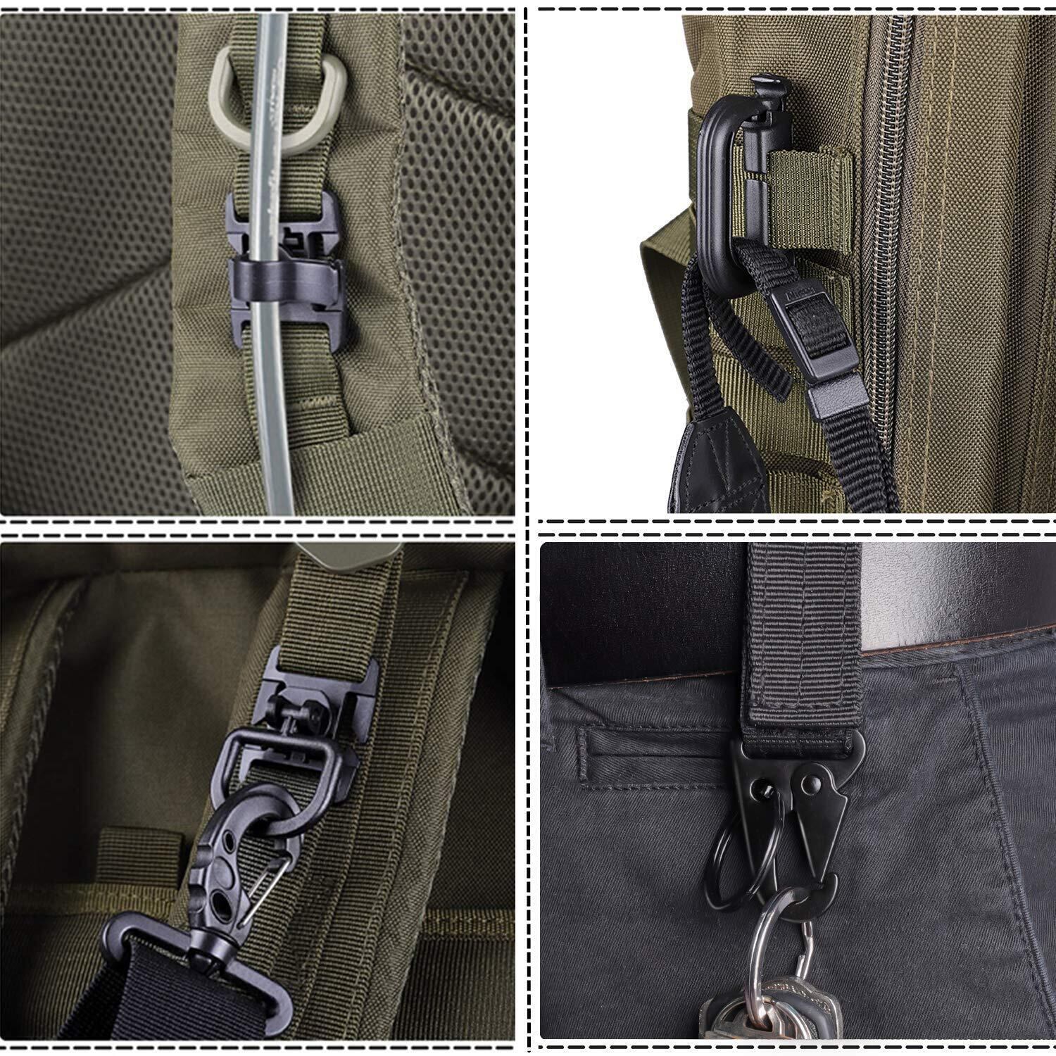 高強度軽量プラスチック Dリング :Dリング ウェビングクリップ MOLLE対応+ 360 回転 なDリング カラビナに似た小型のロック付きDリングはモールシステム等の1インチウェブベルトに取り付けられ、小物類の保持やハイドレーションチューブの固定に便利です。