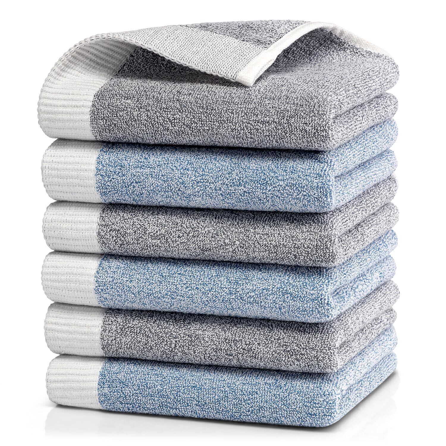 【フェイスタオル 6枚セット】素材:綿100%、サイズ:約33×74cm、重さ:約100g(1枚)、セット内容: グレー3枚 、ブルー3枚。