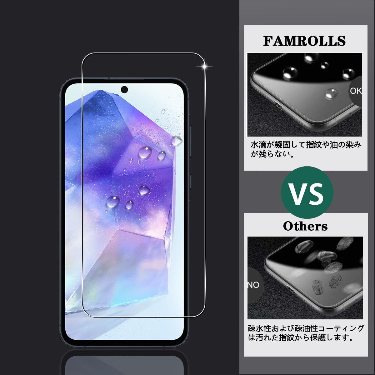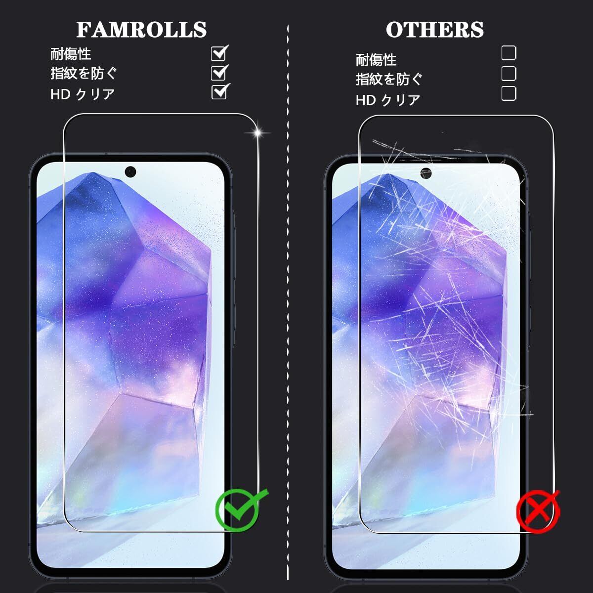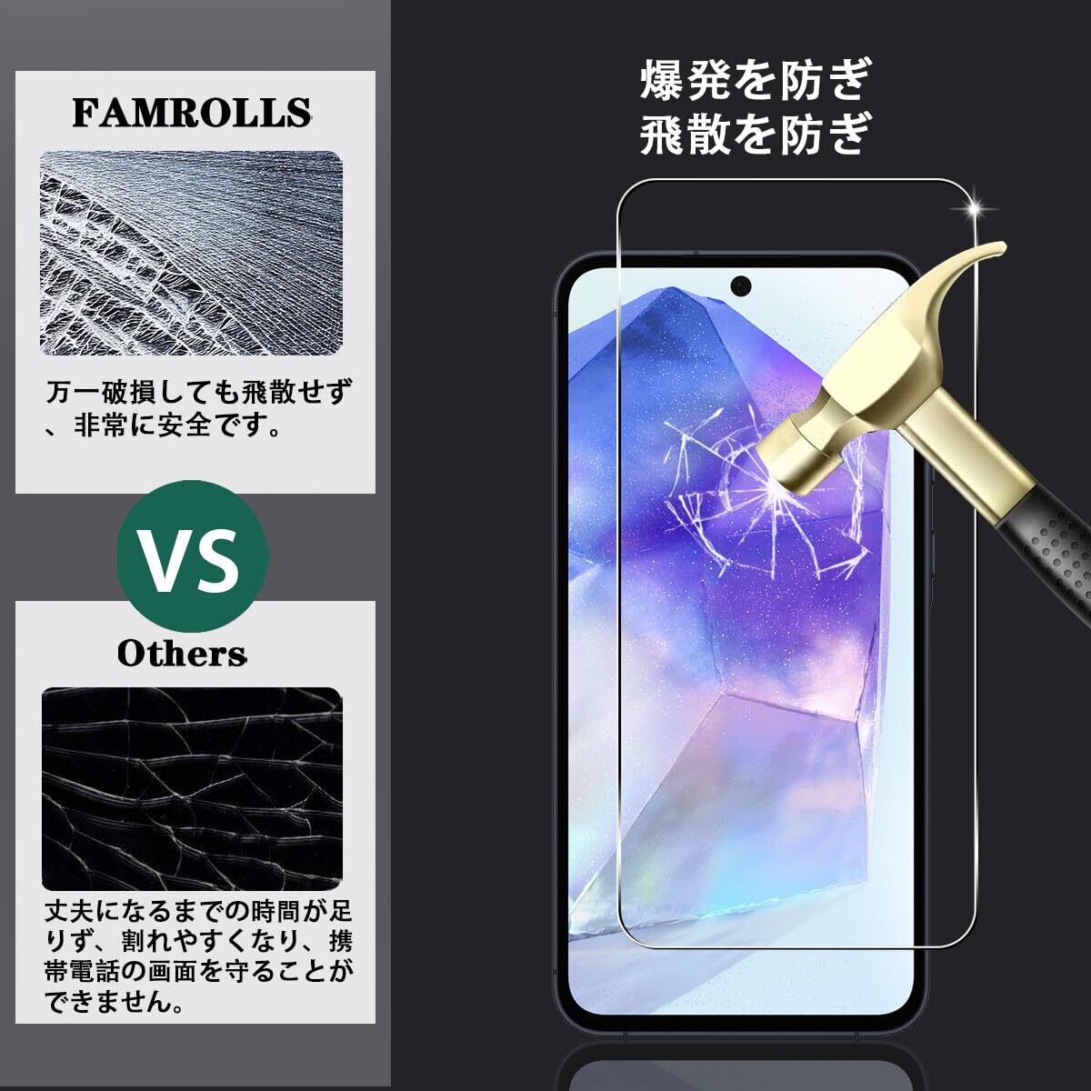 【対応機種】 Galaxy A55 5G 専用。素材に日本製の旭硝子を採用。【四枚セット】 2枚 用 ギャラクシー A55 5G 強化ガラスフィルム+ 2枚カメラ保護フィルム。【FAMROLLS正規品】スマホの周辺アクセサリーを長年手掛けるFAMROLLSメーカーの人気スマホガラスフィルムです。安心してご注文ください。