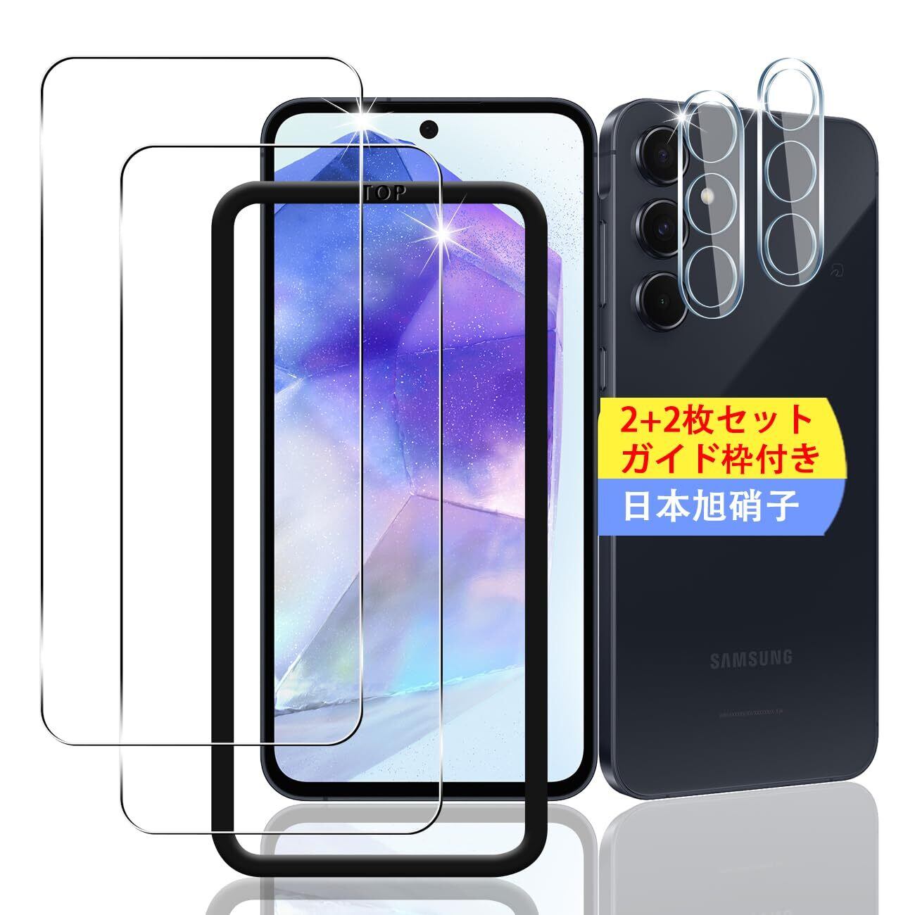 【2+2枚セット ガイド枠付き】 対応 Galaxy A55 5G ガラスフィルム スマホ 保護フィルム (2枚) + 用 ギャラクシー A55 5G レンズ保護フィルム (2枚) 【日本製素材旭硝子製】 用 Galaxy A55 SC-53E SCG27 フィルム 強化ガラスフィルム 全面吸着 高透過率、硬度9H、3D Touch対応、飛散防止、指紋・汚れ防止、気泡ゼロ、ラウンドエッジ加工【FAMROLLS正規品】