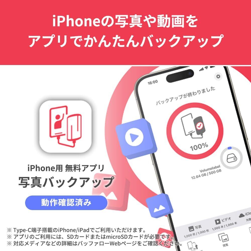 【iPhoneの写真・動画を簡単バックアップ】バッファロー純正アプリ「写真バックアップ(無料)」に対応。Type-C搭載iPhoneに接続し、アプリを起動するだけで、写真や動画をSD/microSDカードに自動でバックアップできます。※対応メディアやアプリの詳細はバッファローWebをご確認ください。