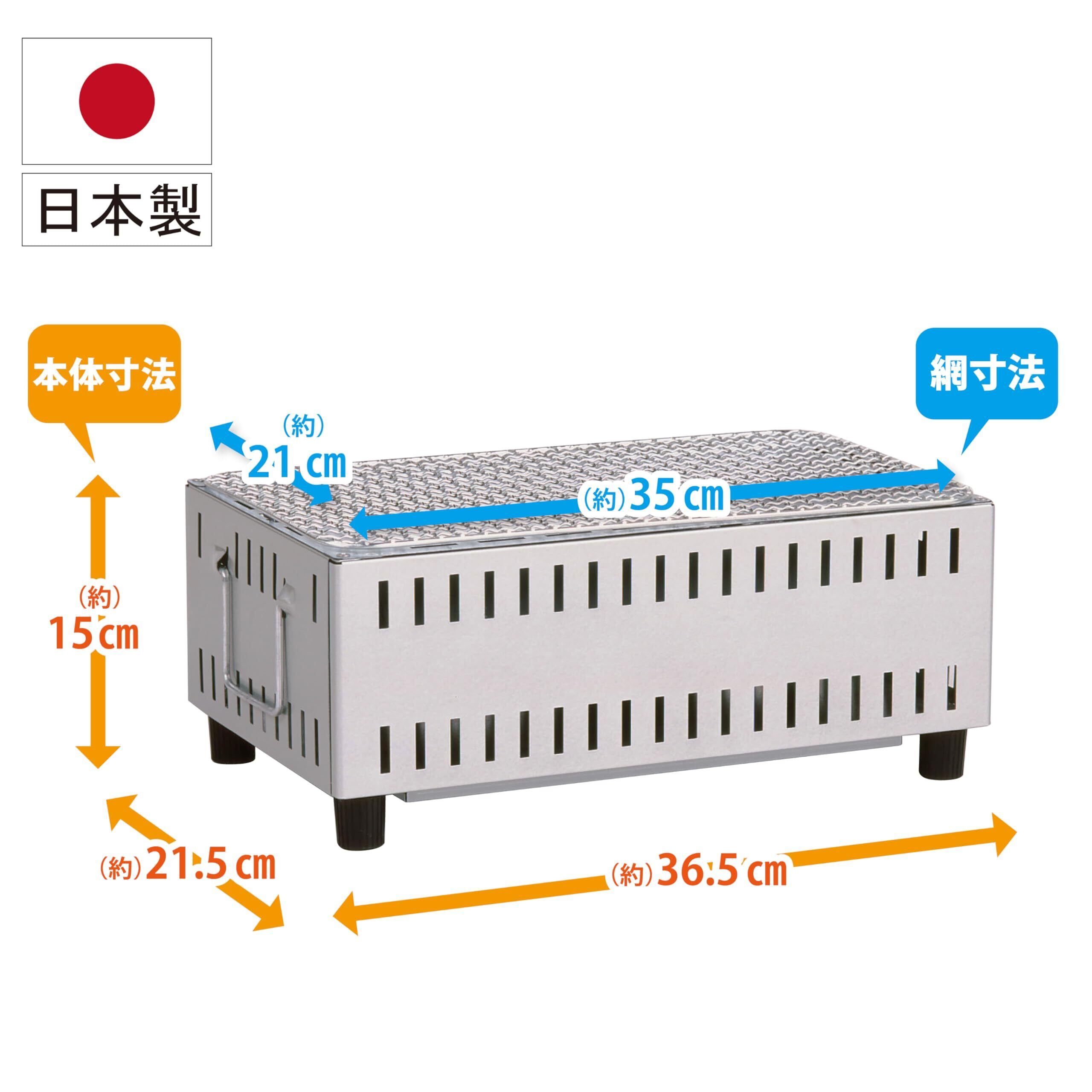【サイズ】本体/約W36.5×D21.5×H15cm、ナカゴ内寸/約W27.5(24.2)×D14(10.3)×H9.5cm、ロストル/約24.7×10.5cm、焼網/約35×21cm