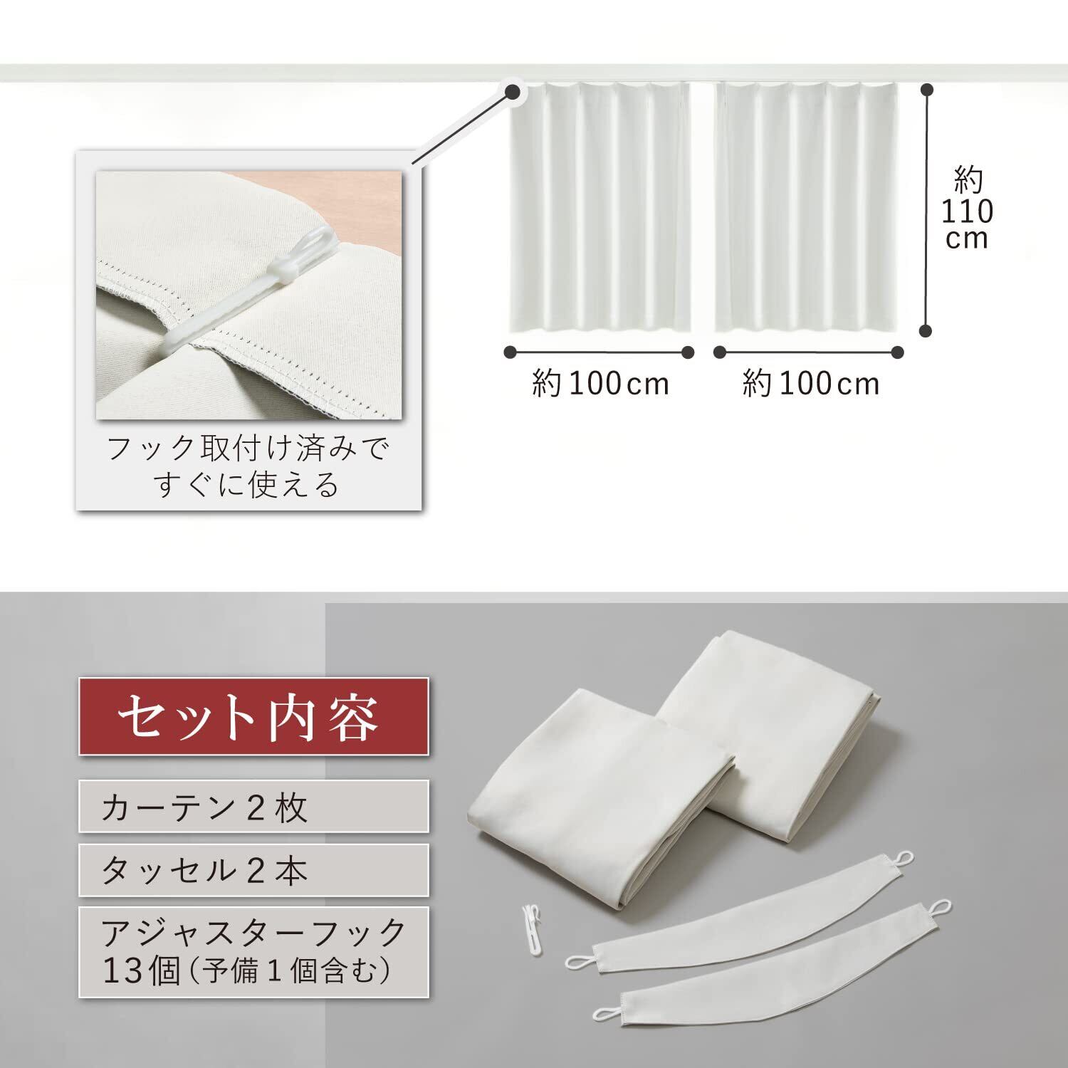 【商品仕様】:サイズ/約幅100×丈110cm、カラー/ベージュ、遮光率/99.94%以上、内容/カーテン2枚・タッセル2本・アジャスターフック13個(予備1個含む)、材質/ポリエステル100%