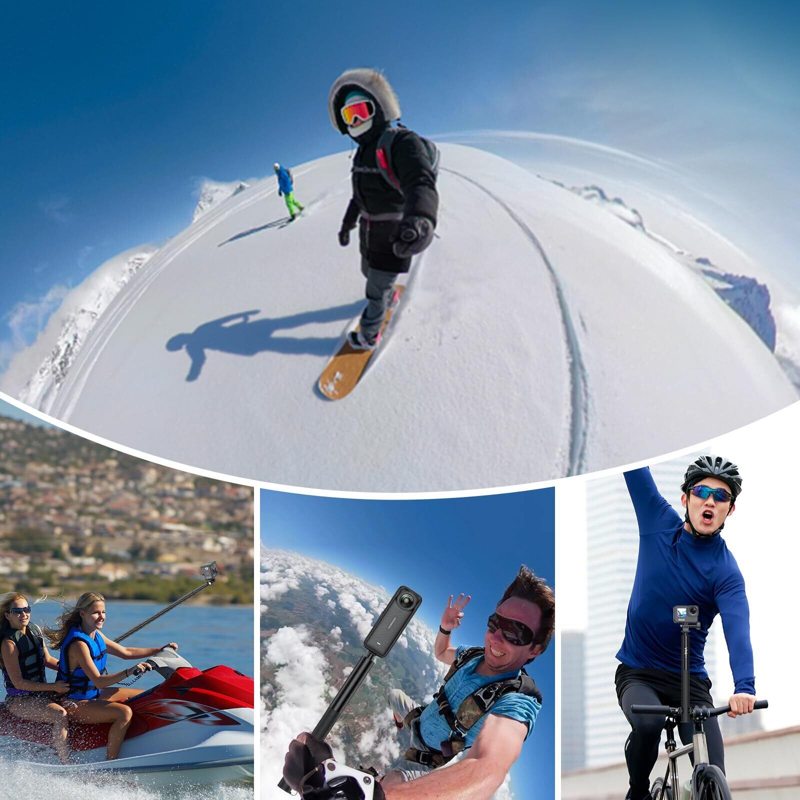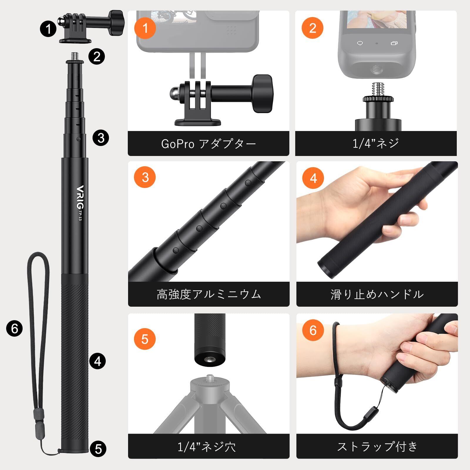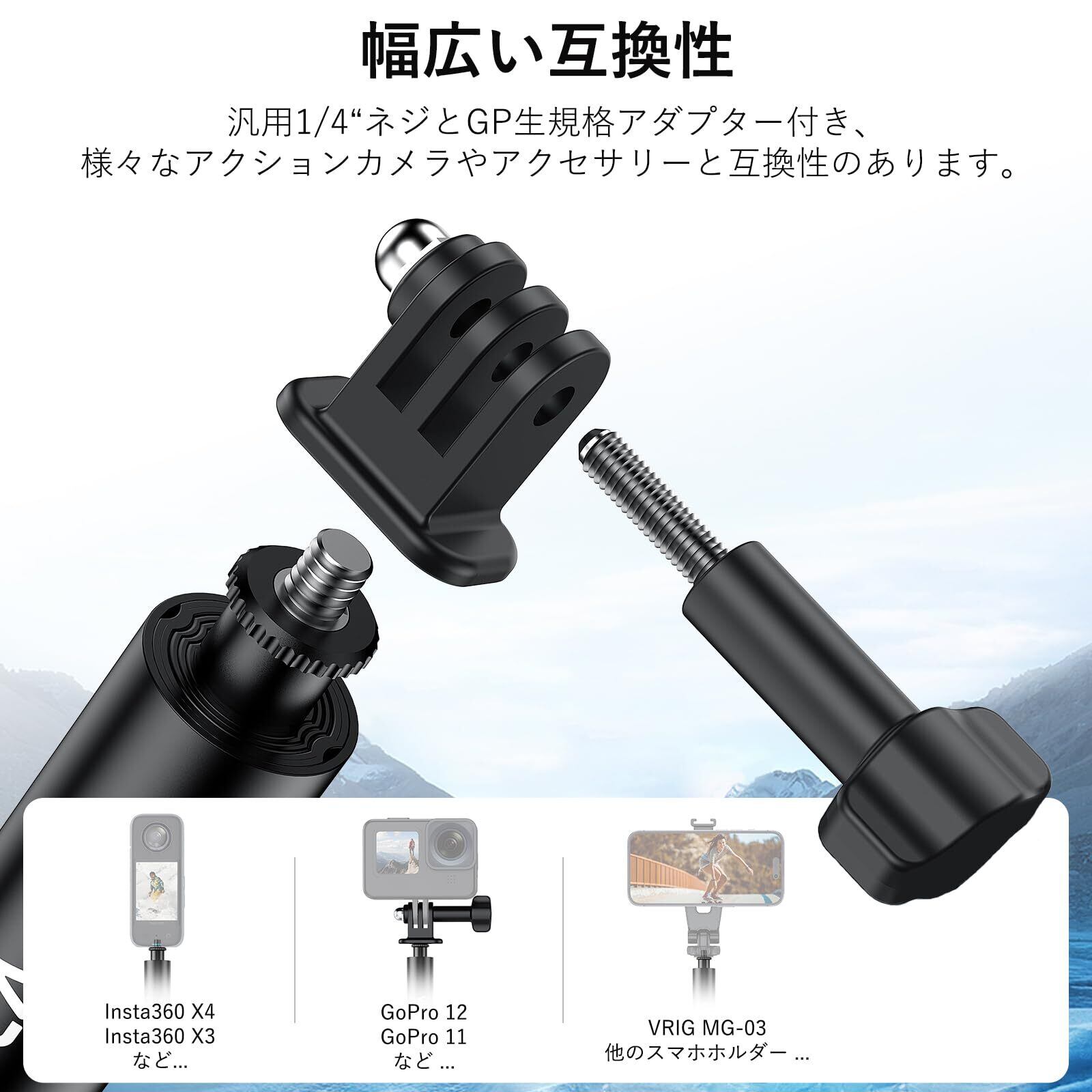 自撮り棒の上部は標準1/4インチネジです。GoProアダプターが付属され、GoProシリーズ、Insta360 X5最新版X4/X3/ONE RS/ONE X2/ONE X/ONEなどのアクションカメラに対応します。