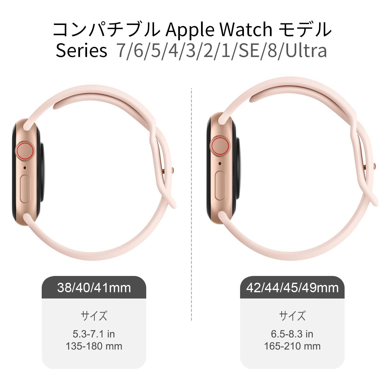 【対応機種】最新Apple Watch Series Series 10/9/8/7/SE/6/5/4/3/2/1/Ultra/Ultra2 49mm/46mm/45mm/44mm/Series3 2 1の42mm交換バンド。49mm/46mm/45mm/44mm/42mm(Series3 2 1)のサイズは165 - 210mmの手首周りに適します。購入する前に、お手首の周りを測定してください。