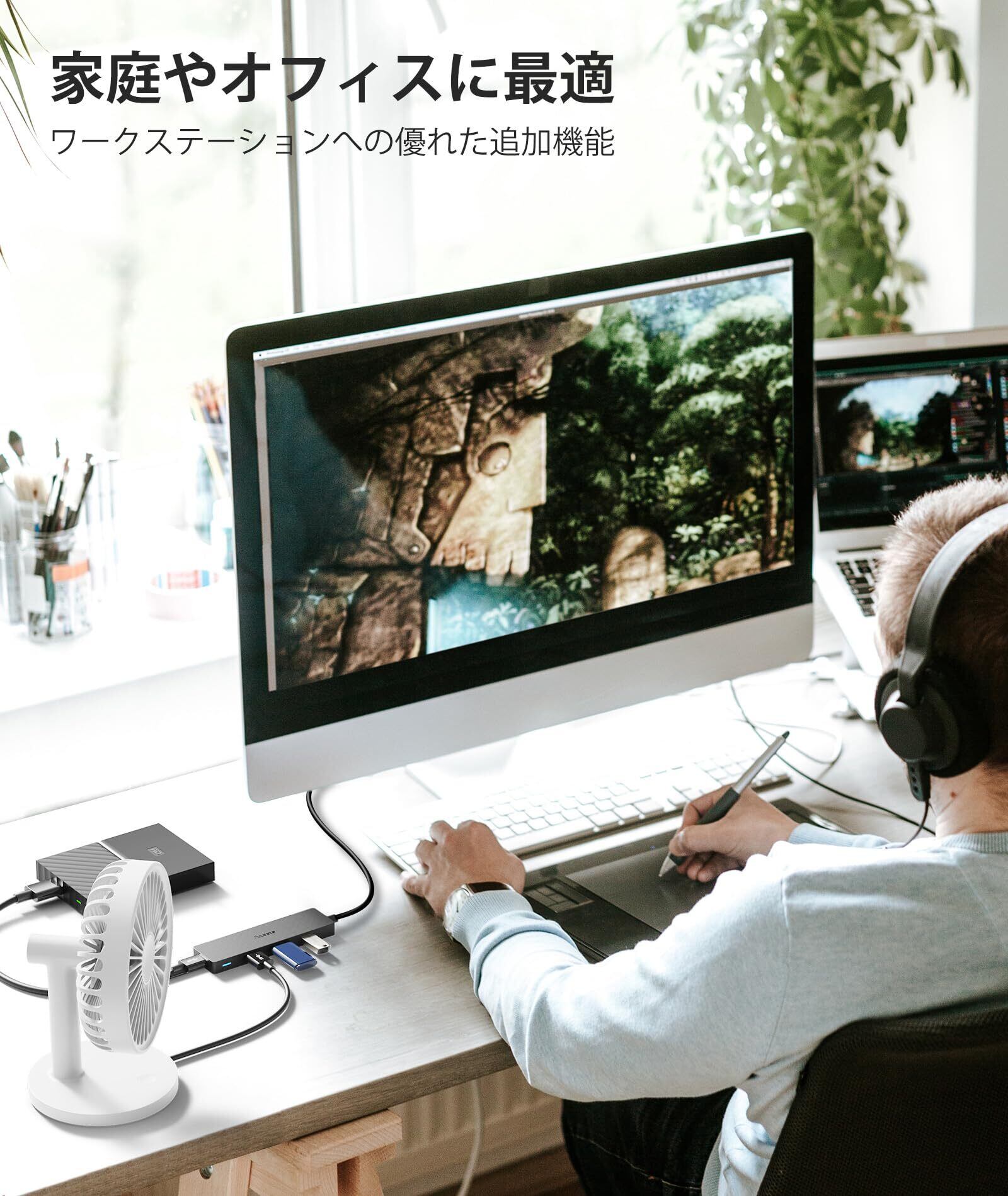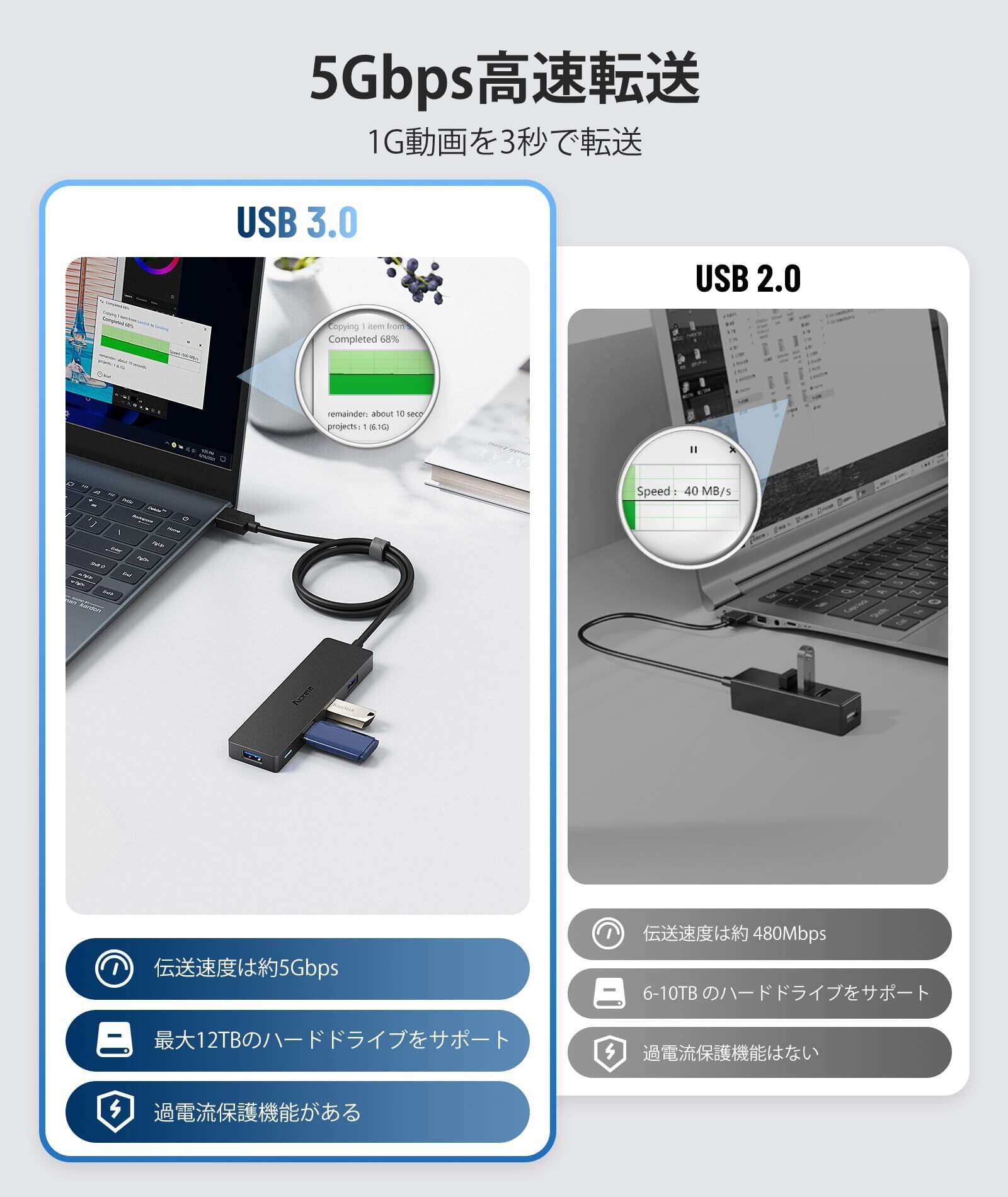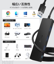 「超高速データ伝送」USB 3.0ハブは、USB 2.0の10倍の速度で最大5 Gbpsのデータ転送速度をサポートし、数秒で大きなファイルをすばやく転送でき、時間を節約し、USB 2.0 (480 Mbps)とUSB 1.1 (12Mbps)の互換ができます。