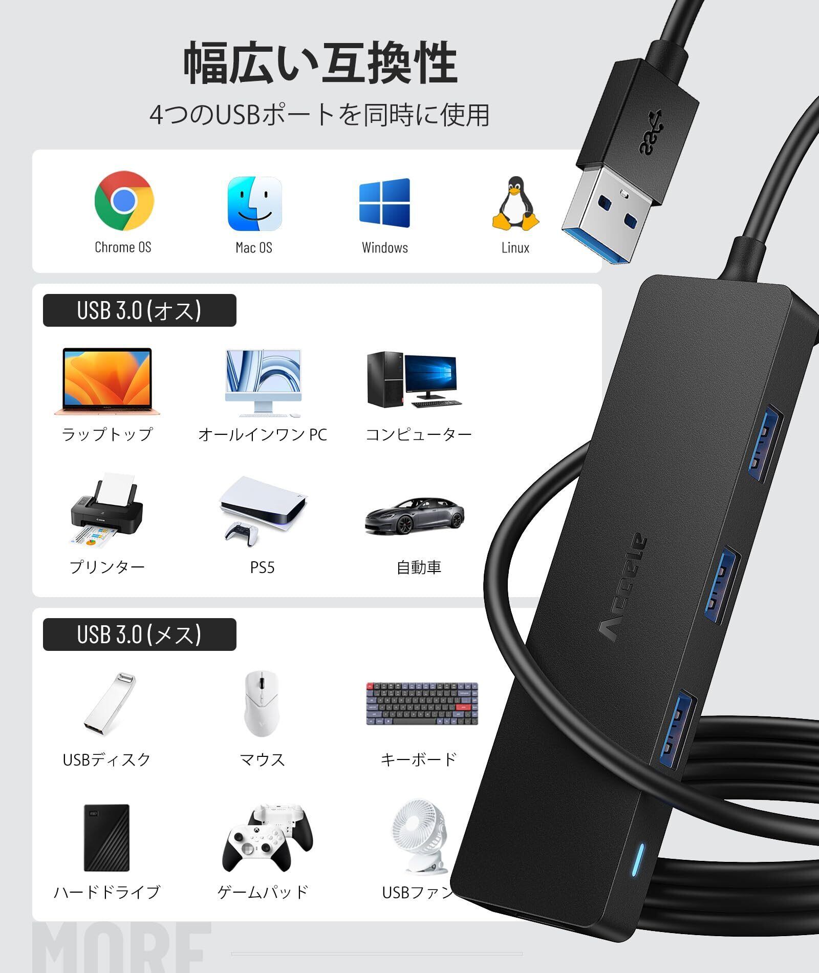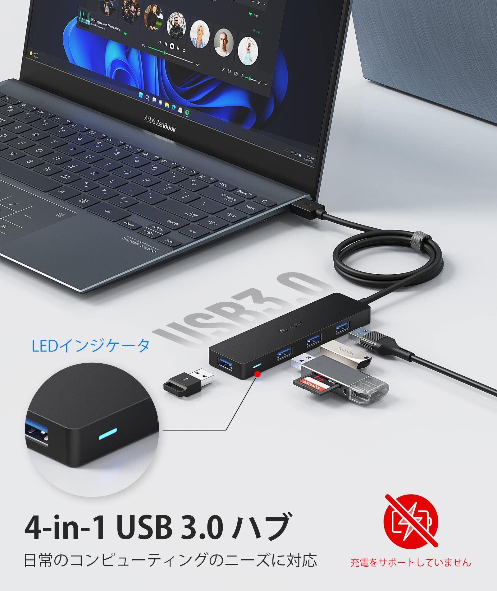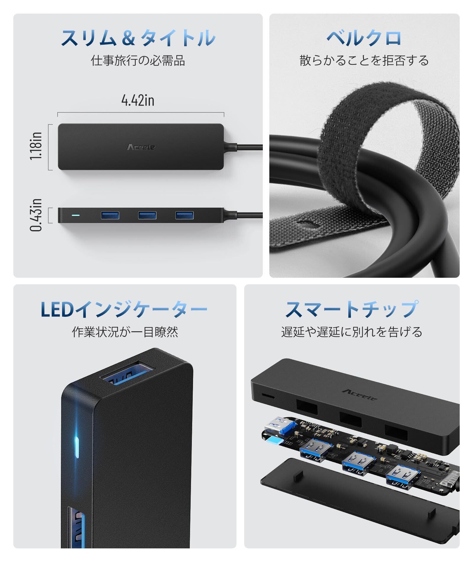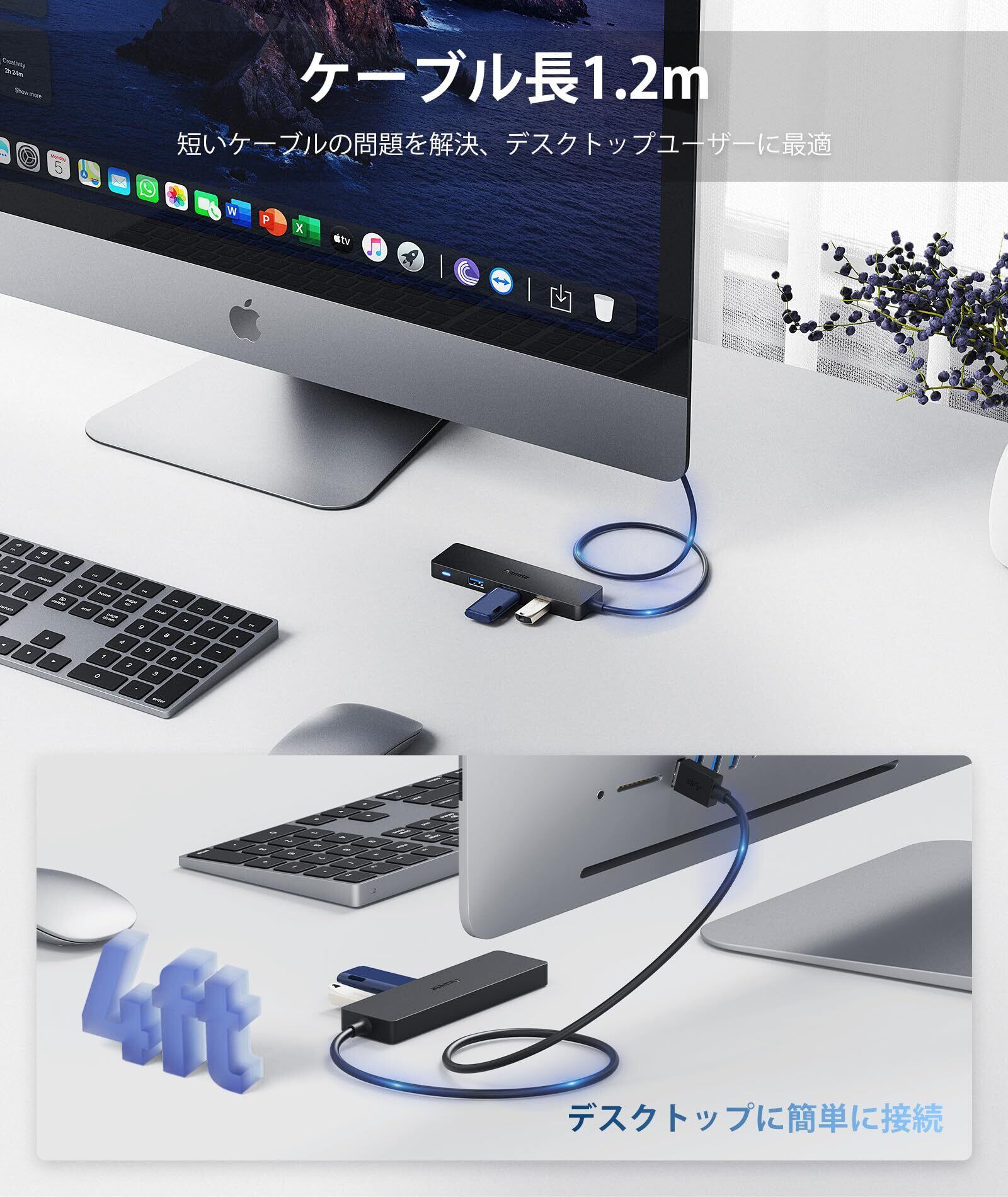 Aceele USB ハブ 4 USB ポート USB 3.0 ウルトラスリム ハブ, USB ハブ 120cm 延長ケーブル 5Gbps 超高速 軽量 PC MacBook/Chromebook Windows/Mac対応 USBハブ テレワーク リモート 在宅勤務