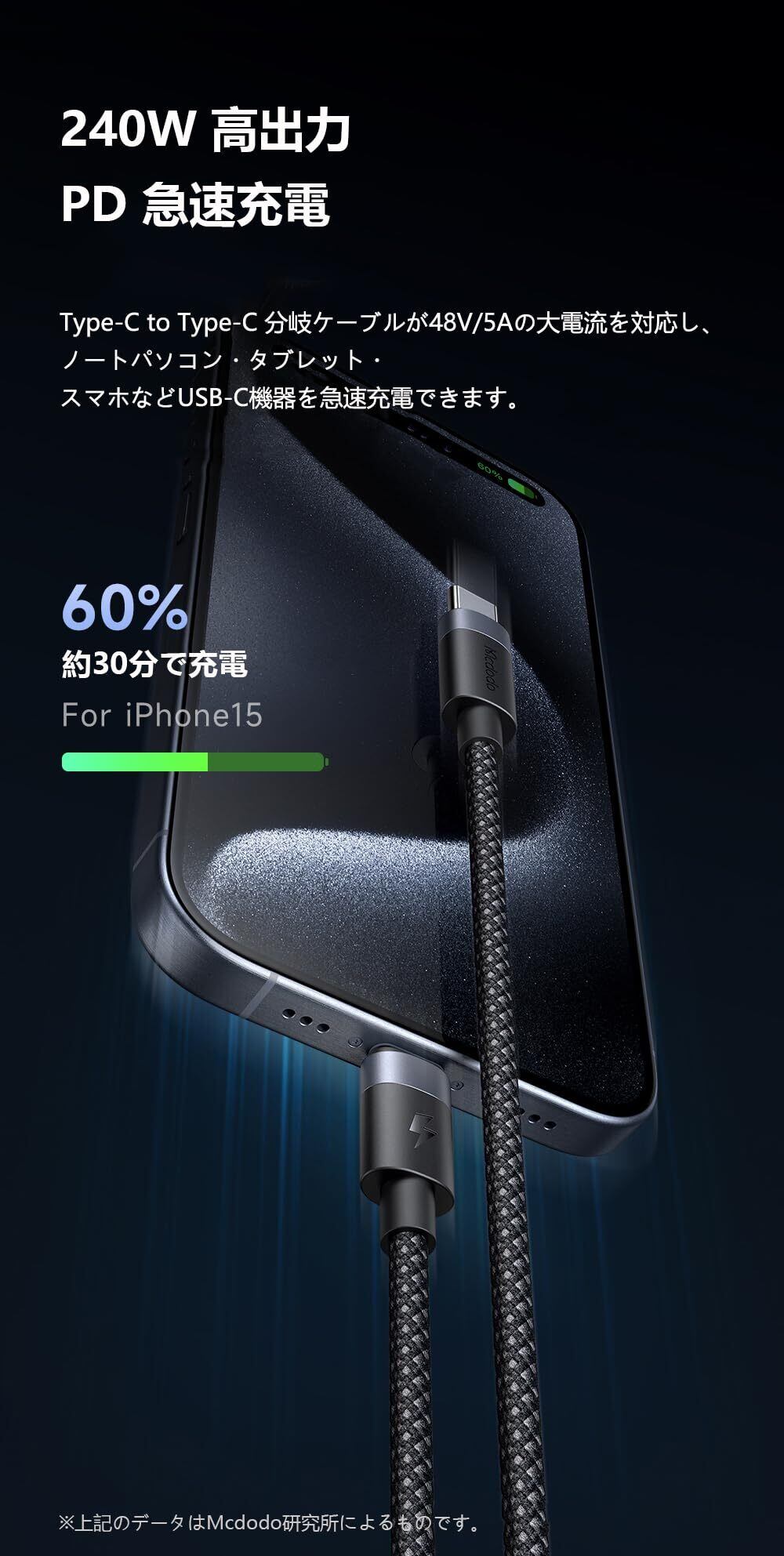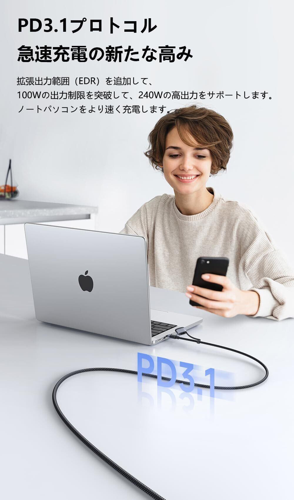 【240W 高出力】:Type-C to Type-C 分岐ケーブルが48V/5Aの大電流を対応し、ノートパソコン・タブレット・スマホなどUSB-C機器を急速充電できます。iPhone 15を約30分で60% まで充電します。※上記のデータはMcdodo研究所によるものです。【PD3.1プロトコル 急速充電の新たな高み】:拡張出力範囲 (EDR) を追加して、100Wの出力制限を突破して、240Wの高出力をサポートします。ノートパソコンをより速く充電します。【高速データ転送も対応】:480Mbpsの伝送スピード、同時に高速充電と高速転送をサポートします。